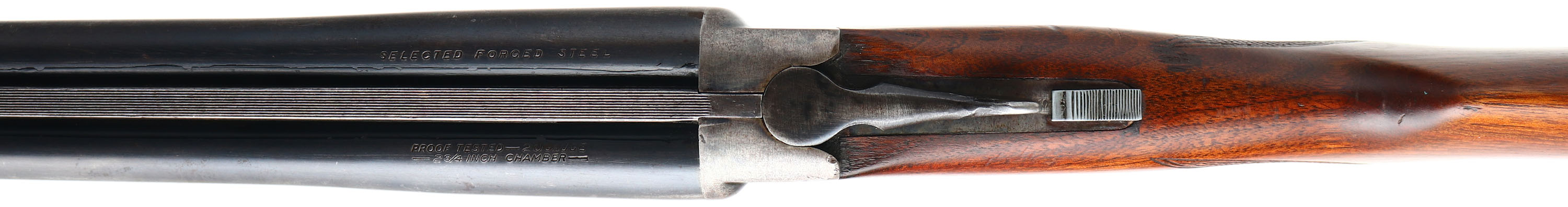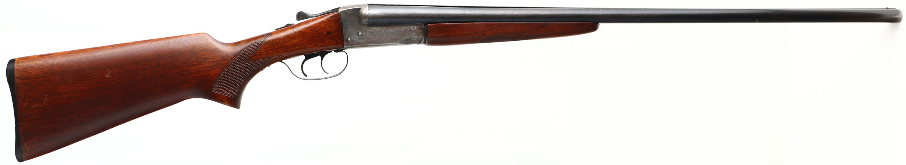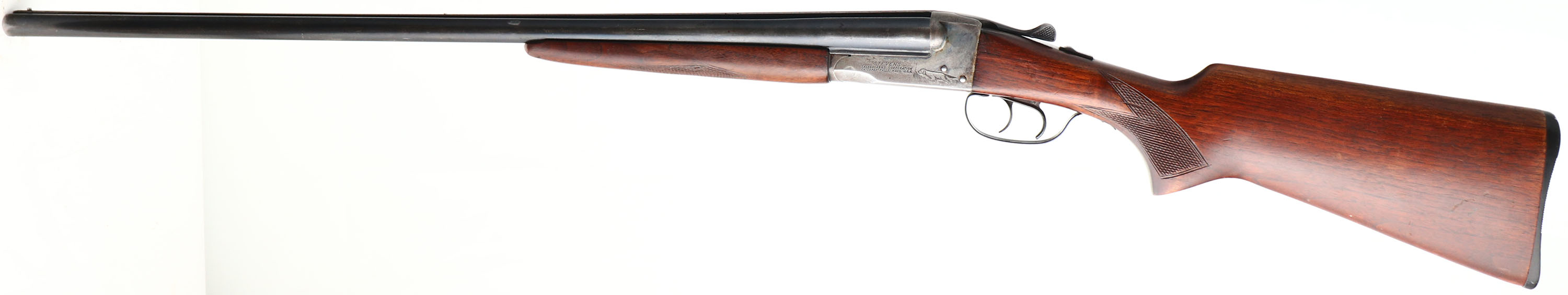 Stevens (Savage), Model 5100, CAL: 20 GA, MFG: 1941-48, SN: NSN, Break Action SxS Shotgun, 28'' barrel. The checkered flat pistol grip stocks are excellent. There are contusions, scrapes & dings. The metal blue finish on the barrels rates 50% & the case-hardened receiver has worn to a mix of metal gray & brown patina, with remnants of case-colors in protected areas. There's a simple engraving of a dog on the left side of the receiver. Bores are excellent. The barrel holds a small steel mid rib bead & a steel front bead. Stock has a grooved plastic buttplate. According to John Callahan, Arms Historian for Savage Arms, guns stamped 5100 were made by the J. Stevens Arms Division of Savage from 1941 to 48. Appx 50,000 were made in that time frame. He indicated that the shotgun is basically a 311 & the 5100 stamp indicates a change in frame design to distinguish between the old & new designs. FFL or C&R Req. - Value: 200 to 400
