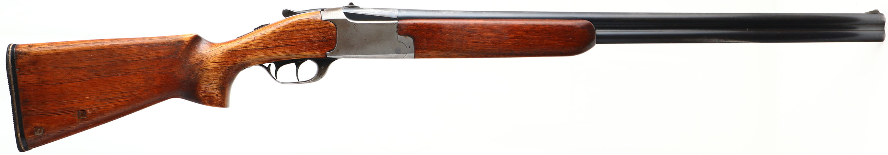 Ranger, Model 103-1, CAL: 12 GA, MFG: 1930's, SN: 2775, Break Action O/U Shotgun, 30'' barrels. The flat pistol grip & cheeked wood stocks are good, having been repaired, sanded & refinished. The belly of the stock split & has two screws/bolts holding it together. There are other contusions, scrapes & dings. The metal blue finish on the barrels rates 70%, with consistent thinning, worn to metal gray & thin brown patina. The receiver has worn to a mix of metal gray & brown patina. Bores are excellent, with visible striations. The barrel has a rear peep sight & blade front sight. Stock has a grooved black rubber buttplate that's worn. The Marlin Model 90, sold to Sears Roebuck were marked Ranger with a specific designation for each of the different gauges. The first Ranger's came out in 1936, and after WW II, (1945) the name was changed to J.C. Higgins. FFL or C&R Req. - Value: 200 to 400