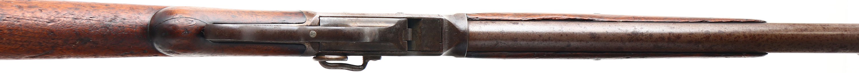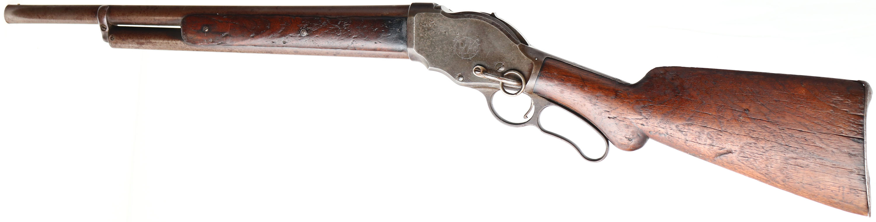 RARE Winchester, Model 1887 Repeating Shotgun, Sling Ring & Staple Riot Gun, CAL: 12 GA, MFG: 1897, Antique, SN: 61880, Lever Action Shotgun, CYL Bore, 20'' barrel. This particular shotgun is stamped ''S.P. R.R.'' on the left side of the receiver for the Southern Pacific Railroad. These early riot guns were used by express messengers, watchmen, prison guards, train hands & law enforcement. They were made with cylinder bore barrels, bored expressly to shot buckshot. With five rounds in the mag & one in the chamber, they were promoted as a superior 6 shooter to the revolver for shooting in the dark or where aim is uncertain, as the buckshot cartridge contained nine bullets compared to a single bullet by a revolver cartridge. This shotgun shows all the authentic wear of its time on the railroad. The original, round knob pistol grip wood stock is fair to good & remains solid, despite being very weathered, oil darkened & having several dry weathered & stress cracks at the wrist, end of tangs & along the sides. The two-piece forend is fair to good, heavily worn, with edge chips, nicks, numerous contusions & scratches, all consistent with its age & use. The metal finish has toned to a mix of gun metal gray & a spotty brown patina, with speckling & pitting. Rare sling ring on staple bar located on the left side of receiver. Bore is good, with spotty areas of roughness. The barrel holds a single front bead. Buttstock carries a checkered metal buttplate. An early lever repeater shotgun, with likely a lot of stories to tell. Antique, No FFL Req. - Value: 800 to 2000