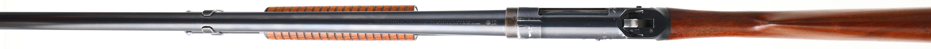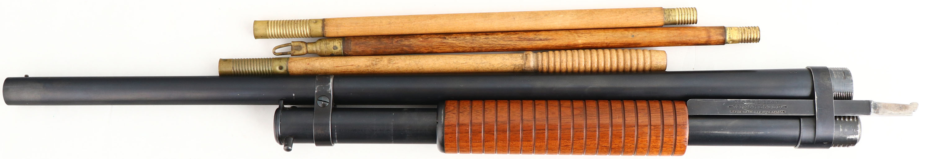 RARE Winchester, Model 1897 FACTORY CASED TWO BARREL SET, 12 Ga., MFG. 1905, SN: 282244, Take-down, second variation, Two barrel Pump Action Shotgun, 32'' Full & 24'' Cyl barrels, with SN's matching. Standard length barrels were 30'' Field & 26'' Bush, so these two 32'' & 24'' barrels were special order. The original round knob pistol grip wood stocks are excellent & solid, however the toe has a large 3'' missing toe break. The stocks show very few minor scratches, or contusions to the excellent original finish. The original metal blue finishes rate, 95% on both barrels, 90% on the receiver. Bores are excellent, bright & shiny. Single front beads. Stock carries a Winchester widow's peak checkered metal buttplate. Shotgun & barrels come stored in the original two barrel mutton leg leather carry case, which is stamped on one of the leather straps ''97'', ''24'', & ''32''. Unfortunately, the seam around part of the lid & the hinge have come unstitched & need repair. Also comes with a three piece wood cleaning rod. Comes with a Cody Winchester Factory Records Letter confirming configuration & dates. This is a very nice special order set, with case & letter. FFL or C&R Req. - Value: 1000 to 2000