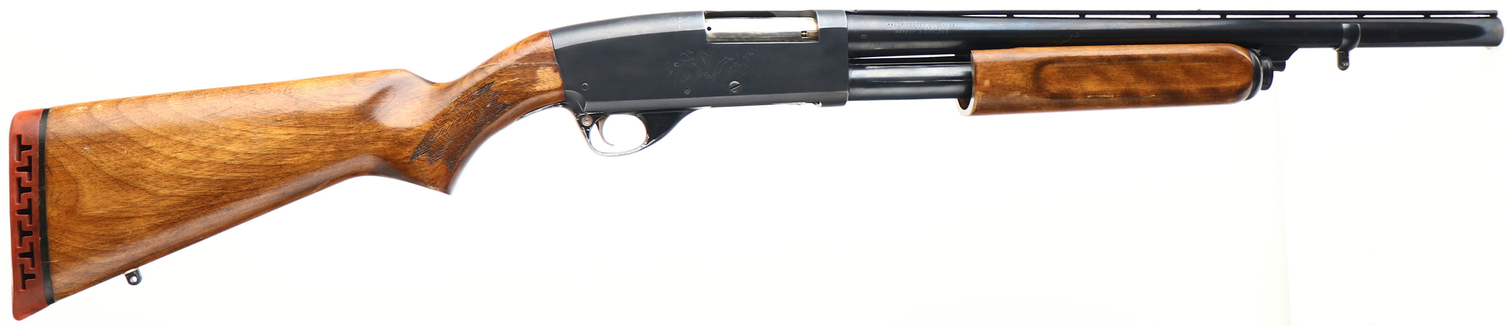 Coast to Coast, Model 367, CAL: 12 GA, MFG: 1960's, SN: 583.200, Pump Action Shotgun, 3'' chamber, Choke: IC+, 19 1/2'' cutoff barrel. Made for Coast to Coast by Savage as a copy of their own Model 30. The original flat pistol grip wood stock & finger grooved forearm are good & solid, despite a large glue repair at the top of wrist behind the receiver. The stocks display an added layer of finish over the original finish. There are small surface scrapes, scratches & contusions, along with some flaking of the original finish under the current finish. The original metal blue finishes rate 90% overall, with numerous scrapes on the Japan black on the trigger guard to about 50%. Bore is excellent. The barrel holds a single mid bead with no front bead. Buttstock carries a period recoil pad. Sling studs. This would make great short barrel home defense pump action shotgun. FFL or C&R Req. - Value: 150 to 300