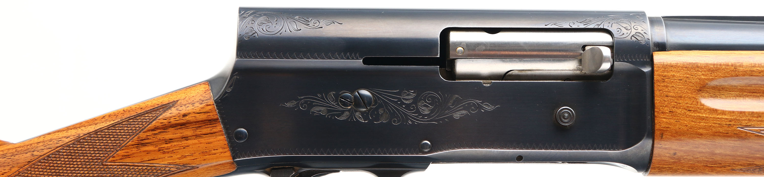 Browning, Model A5 Magnum Twelve, CAL: 12 GA, MFG: 1968, SN: 68V12969, Semi Auto Shotgun, 3'' chamber, 31 1/2'' Ventilated barrel. The original checkered flat pistol grip wood stocks are excellent, as professionally restored. There are virtually no remaining handling marks to the excellent finish. The original metal blue finish rates 95% overall. The receiver displays simple scroll, vine & border engravings. Bore is excellent. The ventilated rib holds a single front bead. Buttstock carries a Browning a ventilated recoil pad. 14'' LOP over pad. An excellent condition overall magnum. FFL Req. - Value: 500 to 1000