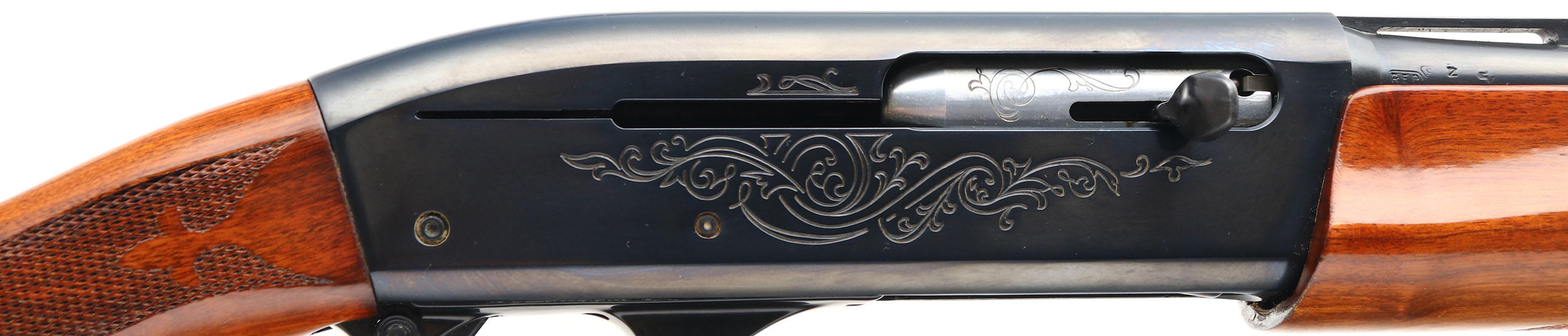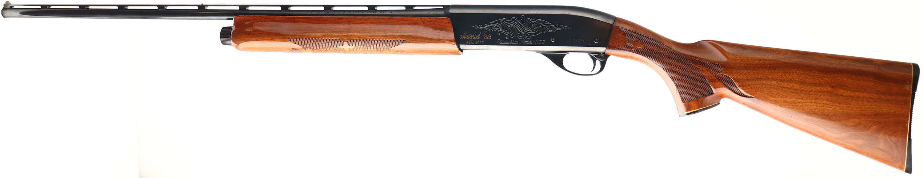 Remington, Model 1100, CAL: 410 GA, MFG: Modern, SN: L180518H, Semi Auto Shotgun, Choke: Skeet, 2 1/2'' Chamber PLASTIC SHELLS ONLY, 25'' Ventilated rib barrel. This is one half of a ''Matched Pair No. 3977'', as so engraved on the left side of the receiver, the other gun not in auction. The original checkered & capped pistol grip wood stocks are excellent, with a few minor scratches or contusions to the original finish. The metal blue finish rates 98% overall, Bore is excellent. The rib holds a small mid rib bead & front white bead. Buttstock carries a Remington buttplate. LOP 13 7/8''. An excellent original condition 410 ga shotgun. FFL Req. - Value: 600 to 1200