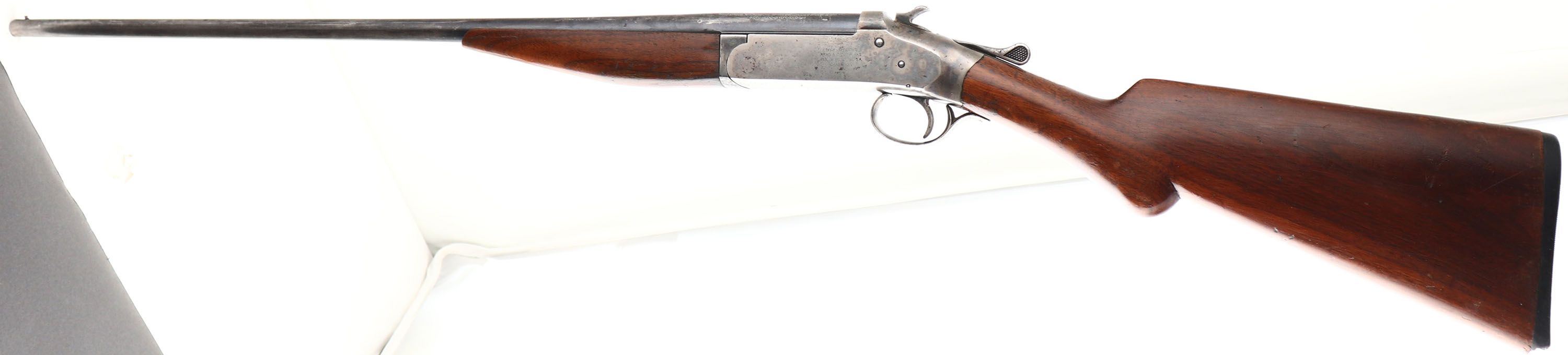 Iver Johnson Arms & Cycle Works Model Champion , CAL: 410 GA, MFG: 1905-08, SN: 85764, Break Action Single Shot Shotgun, 26'' barrel. The pistol grip wood stocks are very good & solid, but there is a small chip at the toe & a 3'' stress crack at the tip of the forend. There are several nicks, scratches & dings to the original finish. The metal blue finish on the barrel rates 40%. The receiver has faded case-coloring, with a few spots of rust pitting & speckling. The receiver is marked ''Iver Johnson Arms & Cycle Works - Fitchburg. MASS. U.S.A.'' & ''Champion'' on the left side. Bore is excellent. Single front bead. Buttstock carries a owl's head black plastic buttplate, with a 1/2'' chip at toe. LOP: 14''. FFL or C&R Req. - Value: 150 to 300