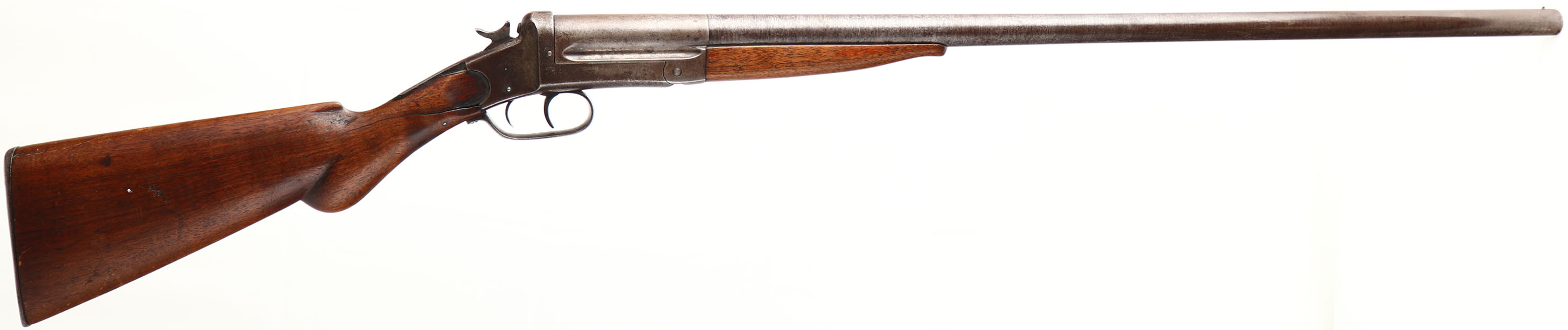 C.S. Shattuck, Model ''American'', CAL:10 Ga., MFG: early 1890's, SN: 638, Break Action Single Shot Shotgun, 34'' barrel. The round knob wood stocks are fair & solid, despite a 4'' & 5'' crack on each side of the wrist emanating from the back of the receiver. There is a silver pin on the right side of wrist adding stability. There stocks exhibit several small scrapes, scratches & contusions to the original finish. The browned finish on the damascus twist barrel is very good. The case-hardened receiver has worn mostly gun metal gray with a spotty thin brown patina. Top of receiver is stamped ''AMERICAN LONDON WEST''. Bore is good, but with roughness & visible striations. The front trigger serves as the break lever for the barrel. The barrel holds a single front bead. Stock carries a smooth metal buttplate. Few of these early large gauge shotguns have survived, so even examples with lot of wear & use still are in high demand amongst collectors of these shotguns. Antique, No FFL Req. - Value: 500 to 1000