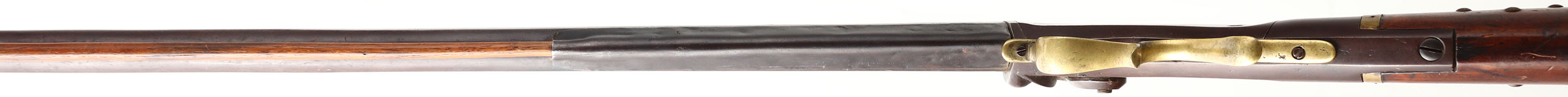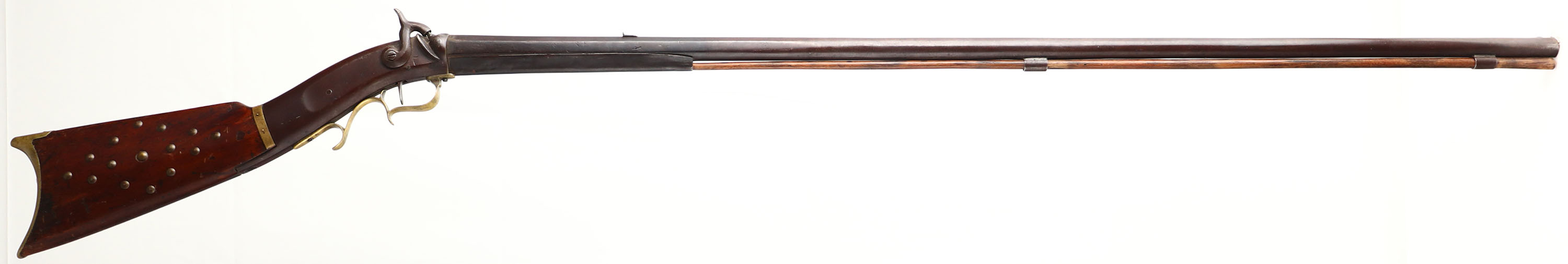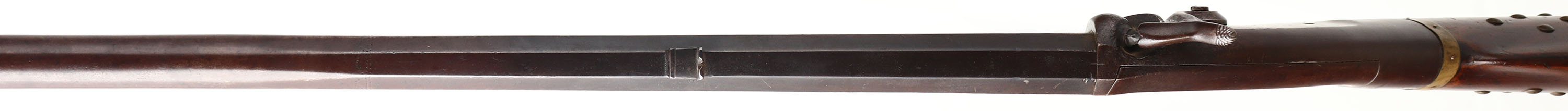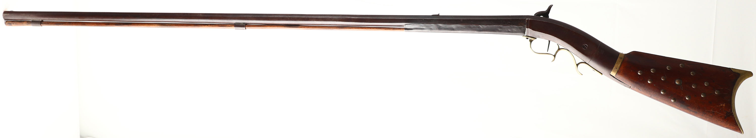 Maker Unknown, Blackpowder Rifle, CAL: 56, MFG: N/A, SN: NSN, Single Shot Percussion Muzzleloader, 43'' barrel. The wood stock is very good, with contusions, scrapes, dings & brass tacks on both sides. The brass hardware has an aged patina. The barrel, receiver & forend have fully worn to a smooth brown patina. Bore is good, consistently rough & dark. Fixed rear sight & small blade front sight. Crescent brass buttplate. Blackpowder, No FFL Req. - Value: 100 to 300