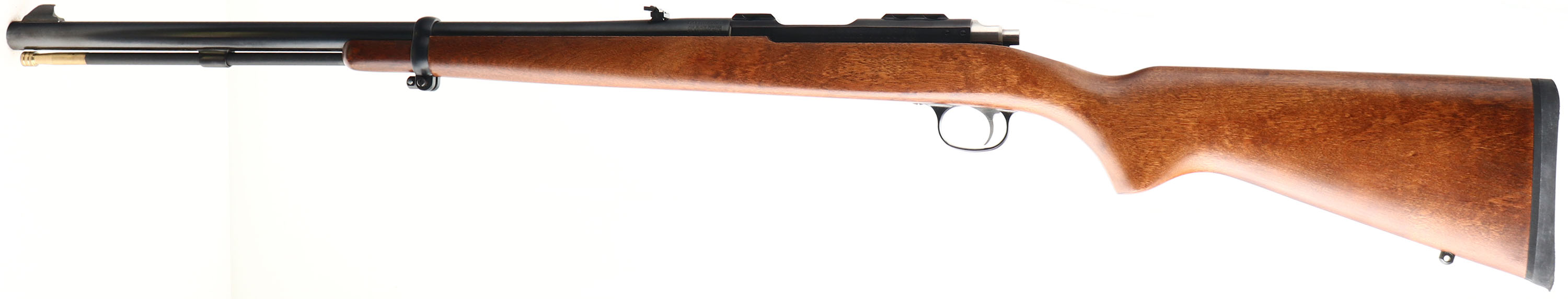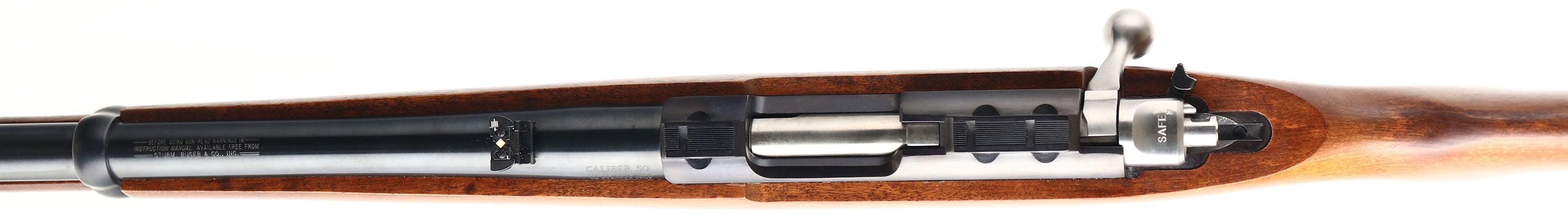 BOXED, Ruger, Model 77/50, CAL: 50, MFG: Modern, SN: 730-19431, Percussion Blackpowder Bolt Action Rifle, 22'' barrel. The flat pistol grip wood stock is excellent. The metal blue finish on the barrel & receiver rates 99%, with the receiver beginning to tone plum. Bore is mint. The barrel holds a folding leaf rear sight & blade front sight. The receiver has an integral scope base. Stock has sling studs & a solid black rubber recoil pad. Comes in factory box, with related paperwork & scope rings. NIB. Blackpowder, No FFL Req. - Value: 300 to 600