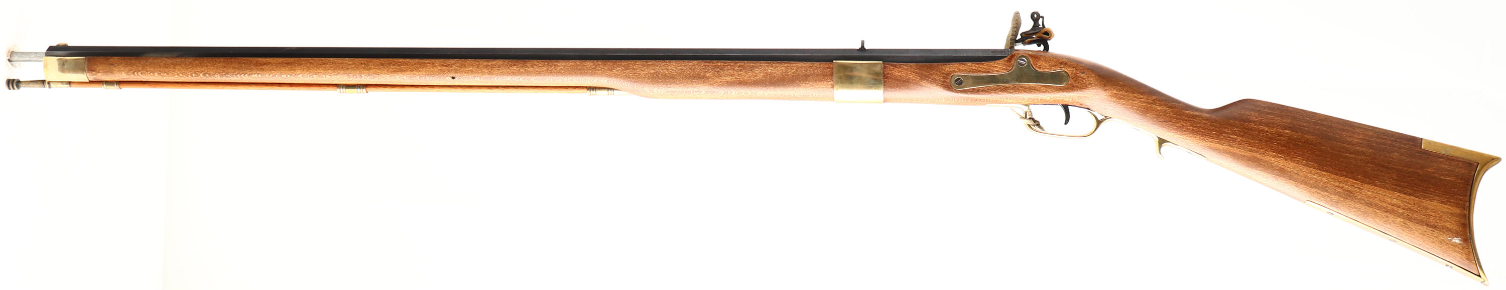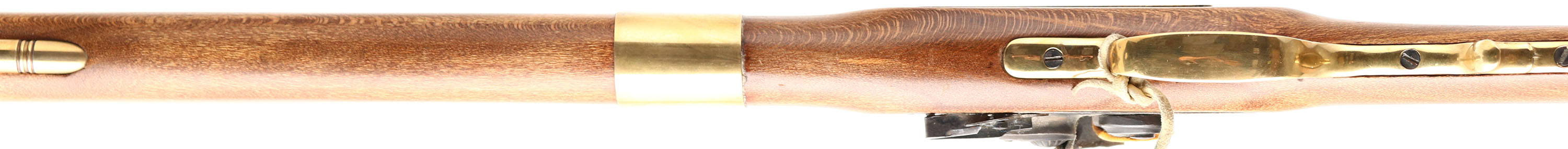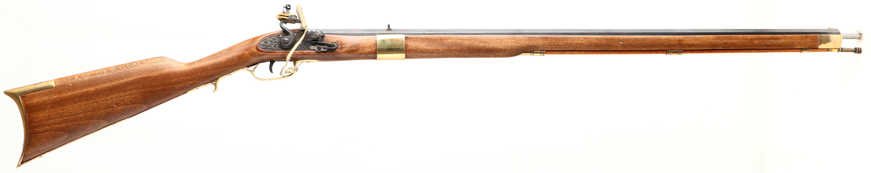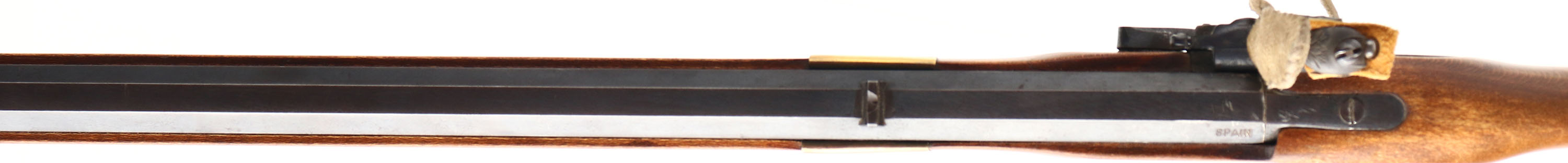 Spanish Flintlock Muzzleloader, CAL: 45, MFG: N/A, SN: NSN, Flintlock Muzzleloader, 33 1/3'' octagon barrel. The only marl on the gun is ''SPAIN'' on the left side of the barrel. The full length straight grip wood stock is excellent. There are minor handling marks. The metal blue finish on the barrel rates 90%, toned to a brown patina, with barrel edges are worn to metal gray. The brass hardware is bright. Bore is excellent. The barrel holds a fixed rear sight & small blade front sight. Stock has a crescent brass buttplate. Leather sheath for the ignitor. Flint present. Double set triggers. Blackpowder, No FFL Req. - Value: 100 to 300