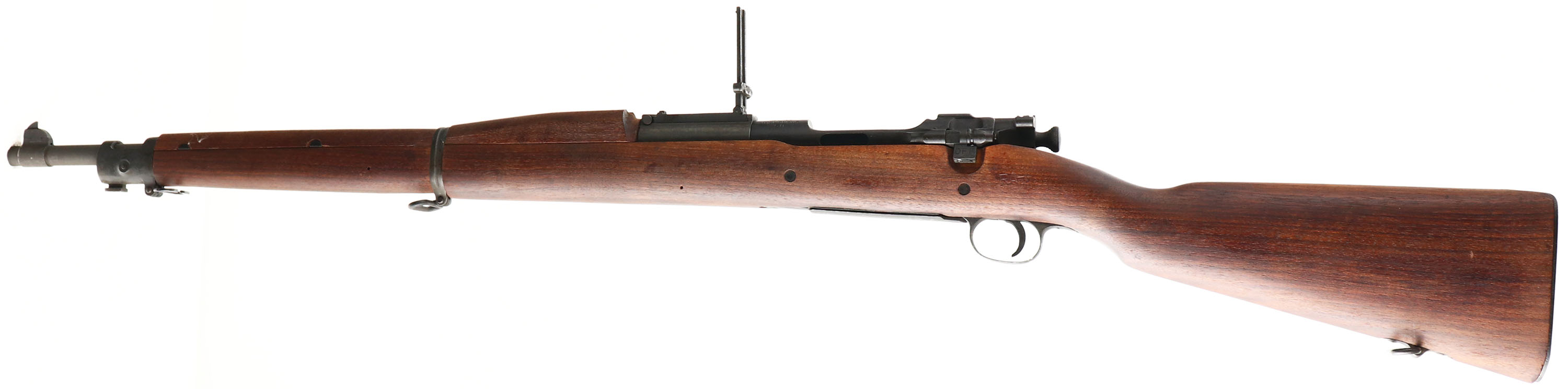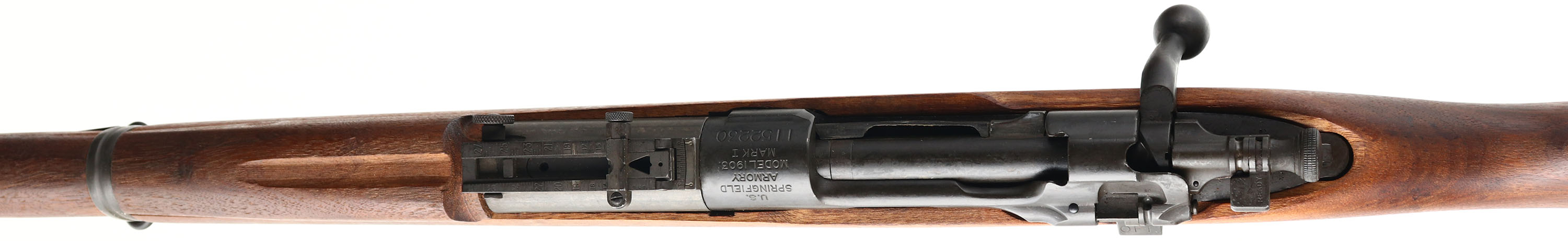Springfield Armory. Model: 1903 Mark 1. Cal: 30-06. : MFG: 1920. S/N: 1152230. Bolt Action Rifle. 24'' Round Barrel. Only 29,000 of this model were ever made & were meant for use in conjunction with a experimental device called the Pedersen device, it was device made to shoot .30 caliber pistol rounds that would replace the bolt of the 1903 Springfield turning your rifle 5 shot rifle, into a 40 shot pistol caliber rifle, the cartridge was known to be underpowered & the war ended before they saw any frontline use, most of the Pederson devices were destroyed making them quite rare, & the rifles would just go back into inventory as standard line rifle. This rifle also has a 1943 replaced barrel with a Type C stock, the type C stock was deigned in 1929 initially for the national match rifles but was approved for use on service rifles in that same year and would be used once the supply of the older type S stock was exhausted, the type C differs from the type S in having a semi-pistol grip & no finger grooves. When they introduced the Type C stock they made a new model for the rifle, & any 1903 rifle that was made with a type C or had its stock replaced with a type C would be marked down as a M1903A1, unless it was the later 03-A3, technically making this rifle a M1903 mark I A1. The replaced Semi-pistol grip walnut stock is excellent, with very little to no wear, ''RA-P'' cartouche in left side of stock above trigger, RA stands for the Raritan Arsenal where they replaced the stock & barrel, ''S'' stamp on bottom of stock Infront of magazine. The Parkerized metal finish rates 90% overall, the parkerized finish is not original but was likely done when it was re-arsenaled. Front top of receiver is marked, ''U.S.'', ''SPRINGFIELD ARMORY'', ''MODEL 1903 MARK I'', S/N, Top end of barrel is marked, ''H S'', flaming bomb, ''10-41'', The H S is a High Standard MFG Co barrel, rear barrel band is marked ''U''. Bore is excellent, bright & shiny with strong rifling. Blade front sight with a windage & elevation adjustable U notch ladder rear sight, marked 4 to 27 on top. Metal Butt plate, with trapdoor. Bottom sling swivels & stacking swivel. FFL or C&R Req. - Value: 1000 to 2000