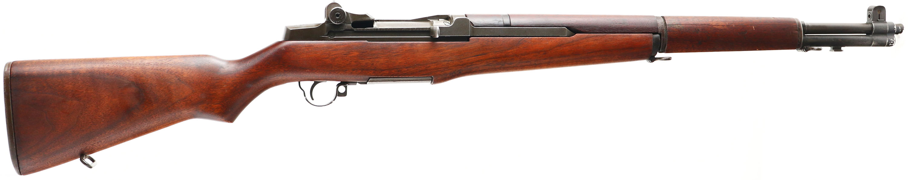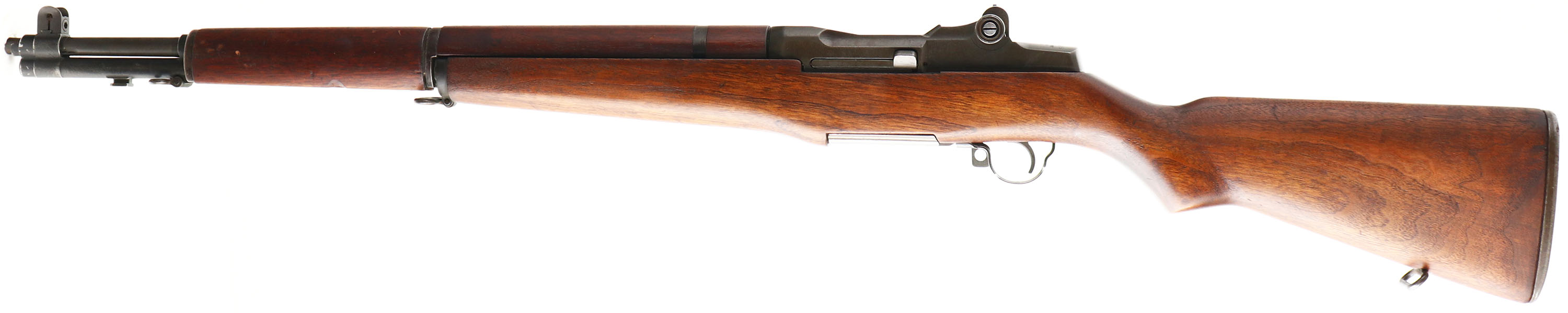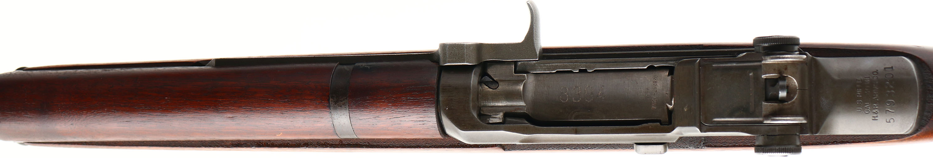 Harrington & Richardson arms, Model: M1 Garand, Cal: .30-06, MFG: 1956, S/N, 5793201, Semi-auto rifle, 24'' barrel. Harrington & Richardson ended M1 Garand production at S/N 5793847, making this rifle one of the last few hundred produced at the H&R factory. The semi-pistol grip wood stock is very good with little to minor wear, likely a after market replacement since there is no cartouches or markings on the stock, 5'' tight crack on right side of forend. The metal finish rates 85% overall with spots of light wear & light rust speckling. Top rear of receiver is marked ''U.S. Rifle'', ''CAL. .30M1'', ''H&R ARMS CO.'', & S/N, top of bolt is marked ''8394'', right side of barrel is marked ''S-A-2-51''. Bore is very good, bright & mirror like with lightly worn rifling. Barrel holds a blade front sight with protective wings, fully adjustable aperture rear sight. Checkered steel trapdoor butt plate. Bottom sling sloops with stacking swivel. M1 Garand production initially stopped in 1945 with the end of WW2 but with the advent of the Korean war production started back up at Springfield in early 1952, along with Springfield 2 more company's also started up production, International Harvester Co. in mid 1951, ended in early 1956, & Harrington & Richardson Arms Co. in early 1952, ended in early 1956. The last service M1 Garand rolled of the Springfield assembly line on may 17th 1957. FFL or C&R Req. - Value: 1200 to 2400