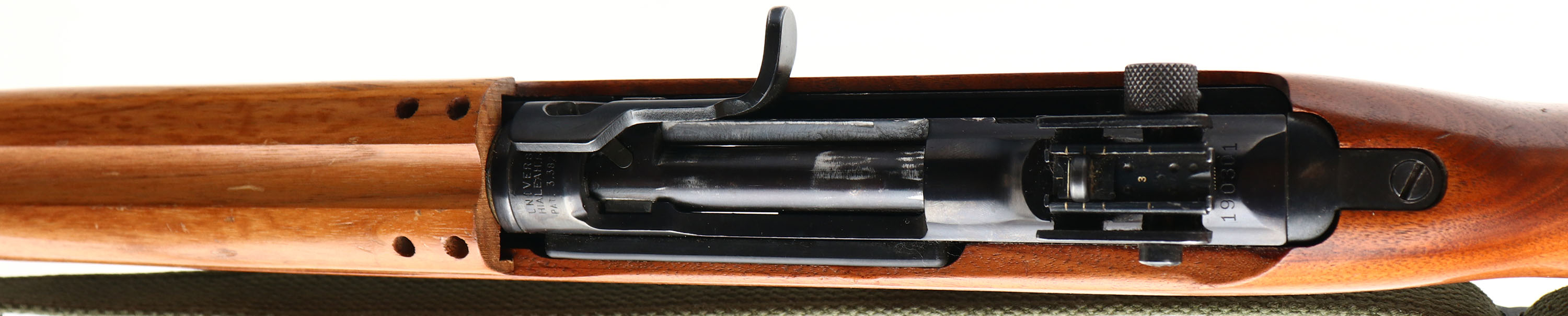 Universal, Model: M1 Carbine, Cal: .30 Carbine, MFG: 1961-72, S/N: 190301, Semi-auto rifle, 18'' barrel. The semi-pistol grip walnut stock is excellent with minor wear. The blued finish rates 93% with areas of normal wear. Rear of receiver is marked with S/N, front of receiver is marked ''UNIVERSAL'', ''HIALEAH, FLA.'', & Patent number. Bore is excellent. Blade front sight with protective wings, fully adjustable aperture rear sight. Checkered steel butt plate, side sling mounts. Has oiler bottle, comes with green canvas sling. No Mag, A excellent M1 carbine replica that doesn't have all the wear & tear as the originals. FFL or C&R Req. - Value: 600 to 1200