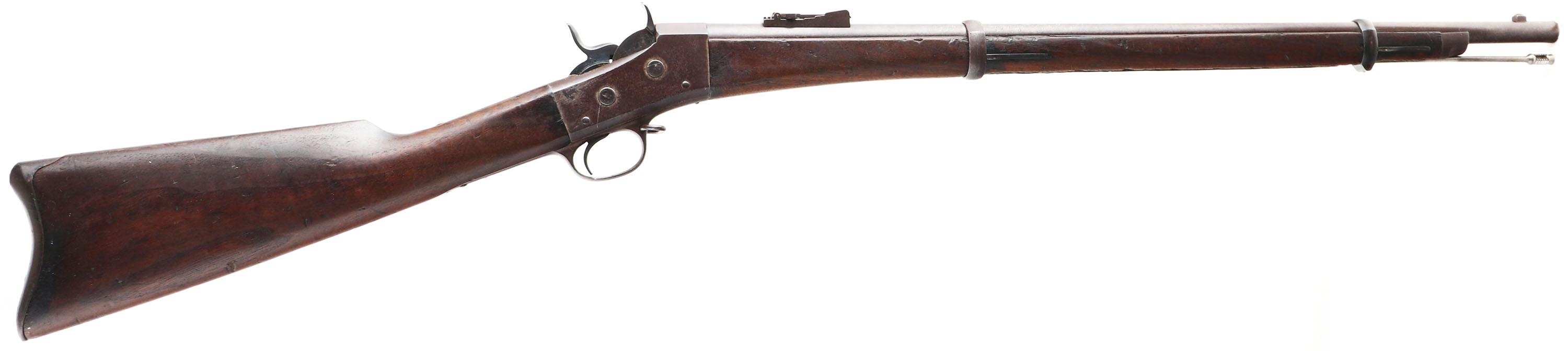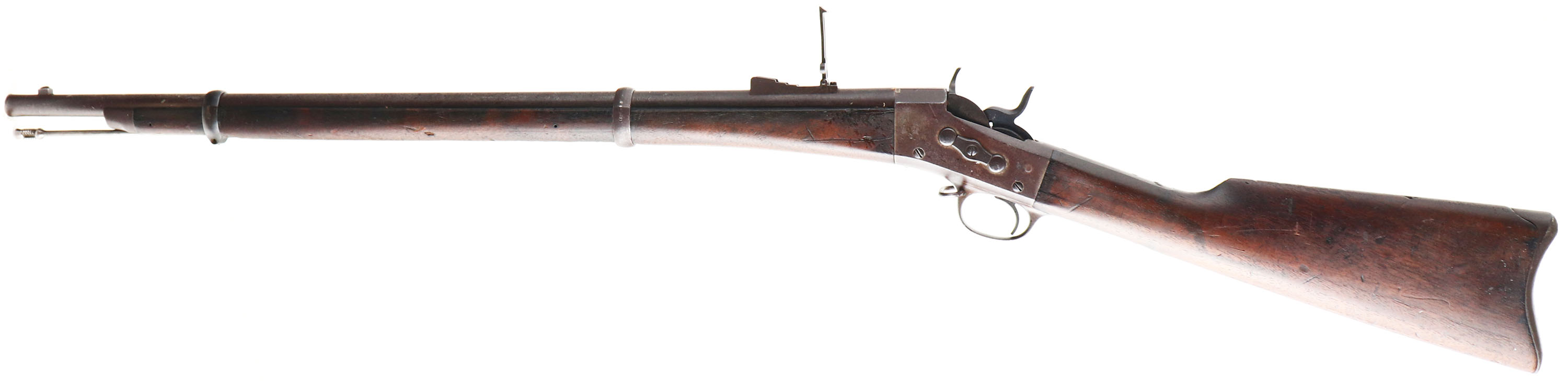 Remington, Model Rolling block, Cal: .43 Spanish, MFG: 1870-80's, S/N: 1848, Rolling block single shot, 28'' barrel. The two piece straight wrist sock is good with scratches, dings, & wear frame use/age, two cracks on stock on eon left side by receiver & on by lower tang, ''48'' marked on bottom of stock. The metal has toned to a brown patina with areas of gray metal, S/N is marked twice on left side of frame under stock, no other markings on the rifle. Bore is very good, bright with some roughness. Barrel holds a barleycorn on block front sight with a stepped tangent/ladder wide V-notch rear sight marked 1 to 4 on base & 5 to 11 on ladder. Stock carries a steel butt plate that has cleaned pitting & patina. On sling loop on trigger guard. Has cleaning rod. Antique No FFL Req. - Value: 500 to 1000