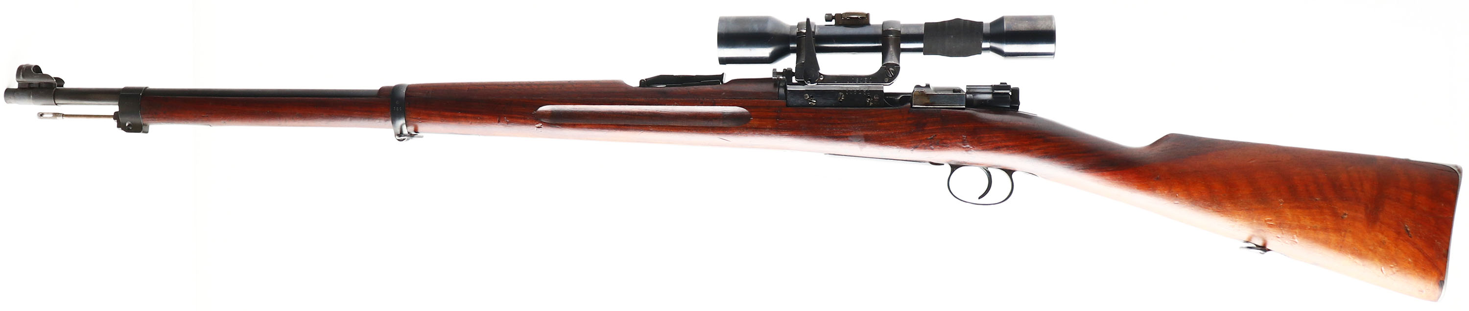 Carl Gustafs Stads Gevarsfaktori, Model: Gevar M1941B, Cal: 6.5x55mm, MFG: 1912, S/N: 306151, Bolt action rifle, 29 1/4'' barrel. The straight wrist wood stock is very good with light nicks, dings, scratches & stains, brass bore/info disc embedded into right cheek of stock, four small screw holes from where a brass trajectory range plate was removed. Three crown proofs on bottom of wrist. The blued metal finish rates 95% on the receiver & 85% on barrel with some light rust & thinning. Top of receiver is marked with a crown over a Swedish latter, ''''CARL GUSTAFS STADS GEVARSFAKTORI'', ''1912'', left side of the pined in scope mount is marked with S/N, scope mount is marked with S/N, & ''72''. S/N matched bolt, scope mount, barrel bands, & butt plate. Bore is excellent, bright & mirror like with strong rifling, has only a few small spots of light roughness. Barrel holds a wide wedge front sight with add on hood, rear sight is the updated SM Sikte F-ram sight for the newer boat tail ''Torped'' ammunition, sight is dated 1955, rear sight is a twist knob U-notch marked 1 to 6, rifle also has the original AJACK 490 scope, scope is marked on the knob base ''Nn1683/1941B''. stock carries a steel butt plate, has patina & cleaned pitting. Bottom sling loops. Has cleaning rod. Comes with original scope carrying case & orginal scope lens cover. In 1941 Sweden adopted a sniper rifle for its military & for the sniper rifles they would take the best shooting M1896 rifles they had & would drill & tap the receiver & mount a scope, & then add a bent bolt handle so they could actually cycle the rifle, this new rifle would be designated the M1941. Then in 1955 the Swedish Government refurbished all the snipers they still had in inventory to a new pattern the M1941 B where they changed the rear iron sight, & fixed a few quality of life issues with the scope mounts like adding the S/N to the side, adding stop screws to prevent over tightening, & peening in the locking screws on the mount, they also got rid of the older M/44 telescopic sight if it had it & made sure all rifles had the AJACK 4x90 scope. Overall a really nice condition Swedish sniper rifle from WW2. FFL or C&R Req. - Value: 2000 to 4000