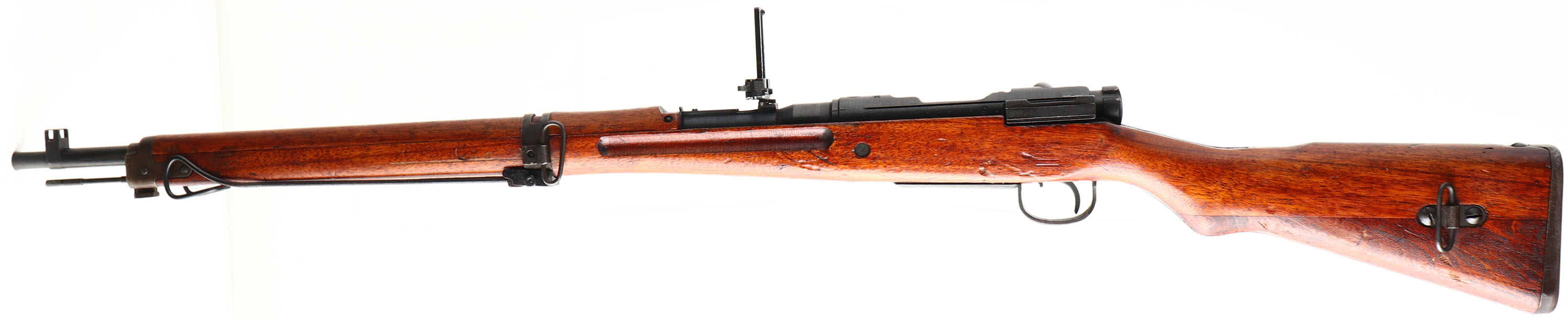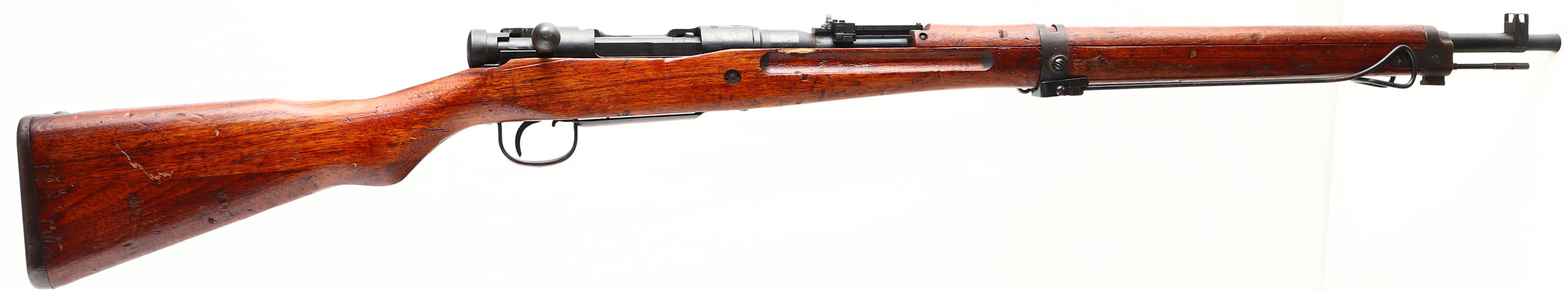Nagoya Arsenal, Model: Type 99, Cal: 7.7x58mm, MFG: 1939-1945, S/N: 64976, 5th series, Bolt Action Rifle. 25 1/2'' Barrel. The semi pistol grip wood stock is very good with small nicks, dings, scratches, & wear from use/age, stock retains nice original color, small chip in top of finger groove of right side of stock, 2'' tight repaired crack on right side of stock by bolt handle. The metal finish rates 85% overall with rust speckling in spots & light scratches. Left side of receiver is marked with S/N, arsenal stamp, top of receiver is marked with a RARE intact chrysanthemum & ''Type 99'' In Japanese, S/N MATCHED bolt. Bore is very good Near excellent, bright & shiny with little to no wear. Barleycorn front sight, Aperture Ladder rear sight marked 3 to 15, Has folding anti-aircraft sight wings & are marked 2 to 3. Metal Butt plate with wear & brown patina. Side sling swivels, has cleaning rod. Comes with a rare monopod. a nice example of a vet bring back Type 99. FFL or C&R Req. - Value: 300 to 600