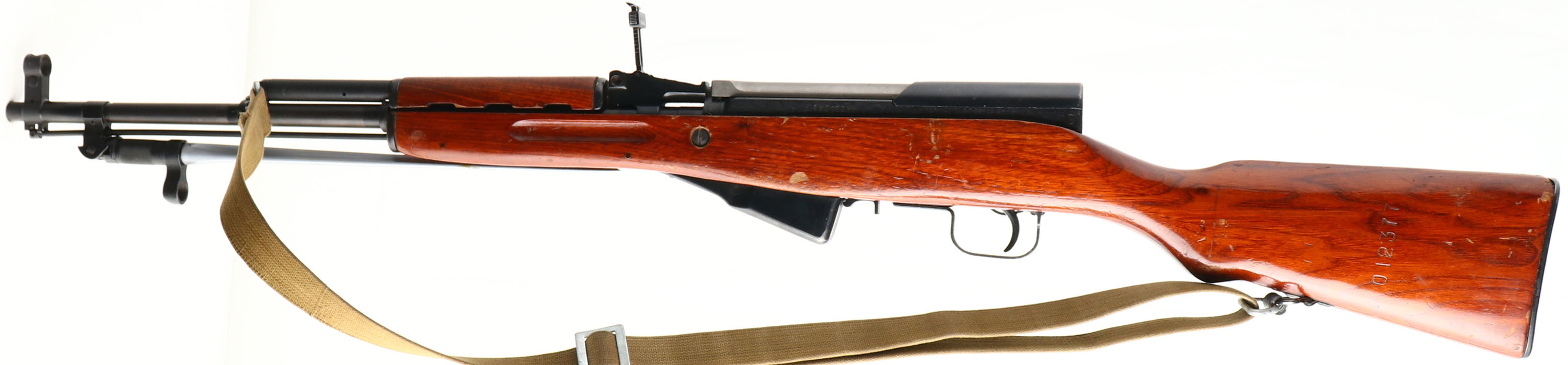 Chinese Factory 0223, Model: Type 56, Cal: 7.62x39, MFG: 1980, S/N: 25012377, Semi-auto Rifle, 20 1/2'' Barrel. The semi-Pistol grip wood stock is very good with light nicks, dings, scratches, & wear, from use/age, stock has a high gloss finish added to it, S/N stamped into left side of stock by cheek. The metal finish rates 95% on the barrel with light wear, & rates 88% on the receiver with minor scratches & very light rust speckling. Left side of receiver is marked ''0223'' in triangle factory stamp, ''TYPE 56 CARBINE'' in Chinese, S/N, & importer marks, Bolt, magazine, & trigger guard are S/N matched. Bore is Excellent, bright & mirror like. Hooded post front sight, tangent U-notch rear sight marked 1 to 10. Steel trapdoor Butt plate with full cleaning kit inside, Butt plate has scratches & wear. One bottom & one side sling mount, has cleaning rod, comes with period correct canvas sling. FFL or C&R Req. - Value: 400 to 800