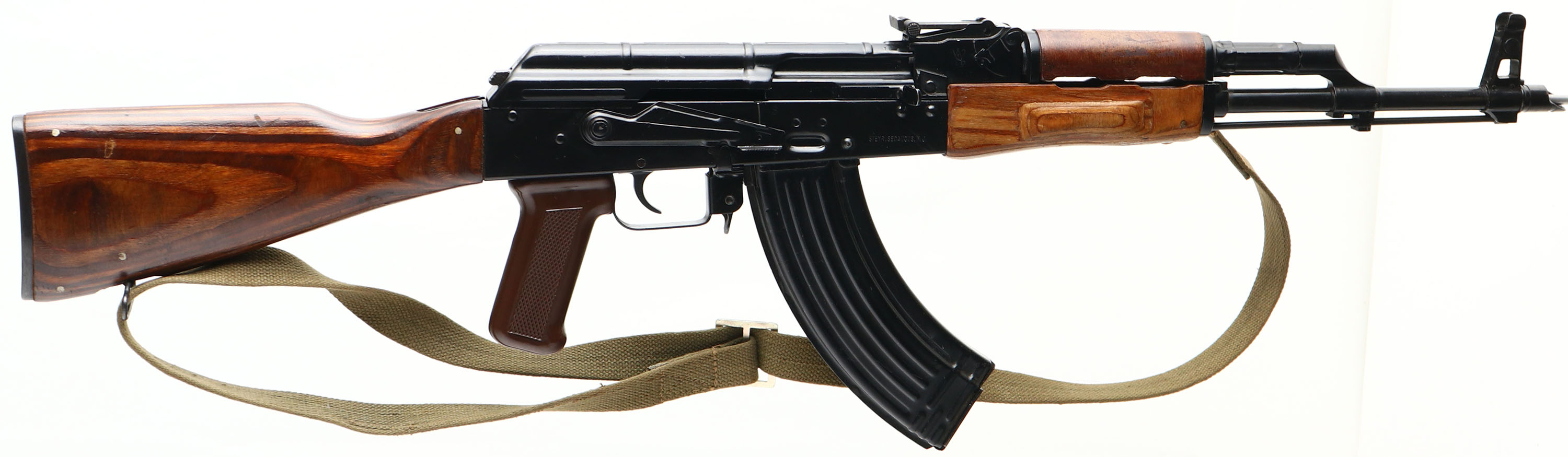 RARE PRE-BAN, MAADI (Factory 54) Model: ARM, Cal: 7.62x39mm, MFG: 1980's, S/N: S000905, Semi-auto rifle, 16 1/4'' threaded barrel. The laminated wood stock & handguard are excellent with only a few minor scuffs, lower handguard has some play back and forth, has a Bakelite plastic checkered pistol grip. The baked on black enamel metal finish rates 90% over all with minor scratches/wear. Left side of receiver is marked with S/N, ''ARM SEMI AUTOMATIC RIFLE'', ''CALIBER 7.62X39'', ''MAADI COMPANY'', ''MADE IN EGYPT'', right side of receiver is marked ''STEYR,SECAUCUS,N.J.'', left side of rear sight block is stamped with the MAADI Logo, right side of rear sight block is stamped with a ''Pharaoh's Crown'' crest. Bore is excellent, bright & mirror like. Barrel holds a adjustable post front sight with protective wings, Tangent U-notch rear sight marked 1 to 10. stock carries a steel trapdoor butt plate. Rifle has the cleaning rod & comes with a green canvas sling, also has the bayonet lug, reference lot # 5821 for more mags for this rifle. Only about 2000 of these rifle were imported before the ban making them quite rare. Also these Rifles are almost a exact Semi-auto duplicate of the Russian AKM, other that the rear sight markings being pushed to 1000 Meters instead of 800 & the Bakelite plastic pistol grip rather than a wood, & is about as close as you can get on the U.S. market to a real Russian AKM. FFL Req. - Value: 1000 to 5000