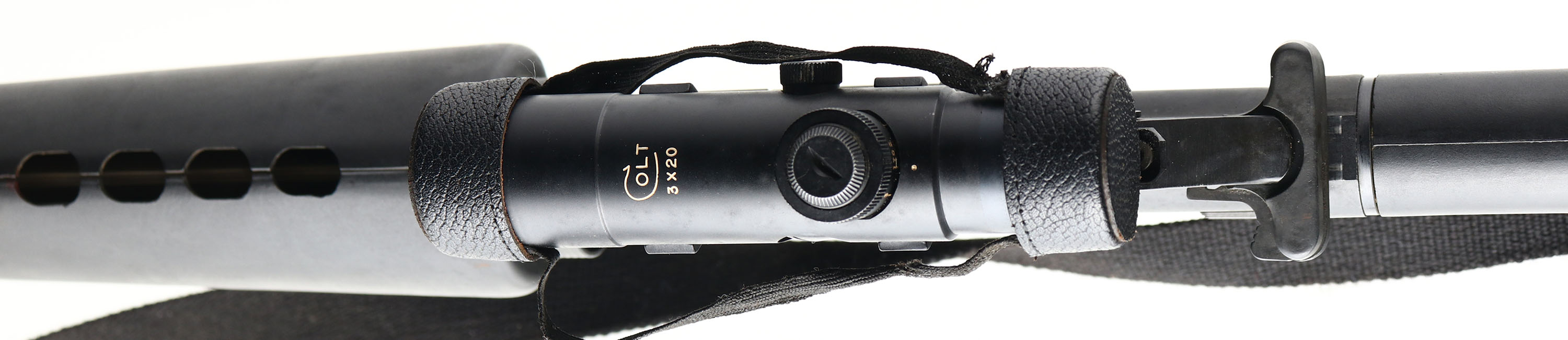 Colt, Model: AR-15 SP1 Pre-ban, Cal: .223, MFG: 1979-93, S/N: SP204887, Semi-auto rifle, 20'' barrel. The polymer stock, handguard & pistol grip are very good with light scratches. The metal finish rates 90% overall with light wear & scratches. Left side of receiver is marked with the rampant colt in circle logo, ''COLT'', ''AR-15'', CAL: .223'', ''MODEL: SP1'', S/N, ''COLT'S FIREARMS DIVISION'', ''COLT INDUSTRIES'', ''HARTFORD, CONN.'', ''U.S.A.'', top of barrel is marked ''C MP CHROME BORE''. Bore is excellent. Barrel holds a post front sight with protective wings, carry hand has a 2 position aperture rear sight, also comes with a colt 3X scope that mounts to carry handle, scope is marked ''COLT'', ''3 x 20''. Stock carried a plastic, checkered trapdoor butt plate. Bottom sling loops. Comes with black nylon sling, bayonet with sheath, & one 30 Rd. mag. A excellent example of the early Colt AR-15 with some nice accessories. FFL or C&R Req. - Value: 1500 to 3500