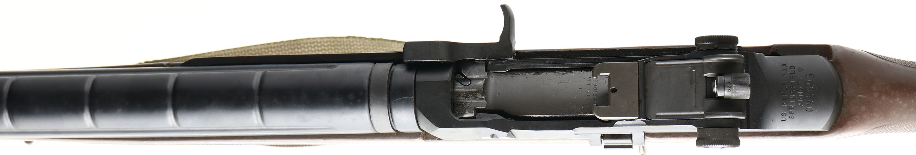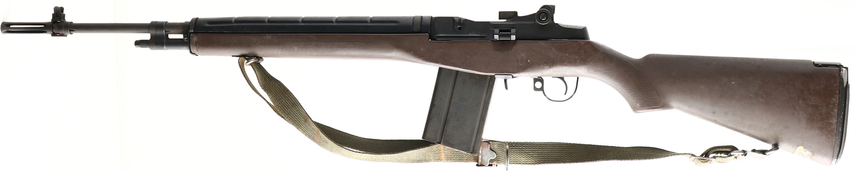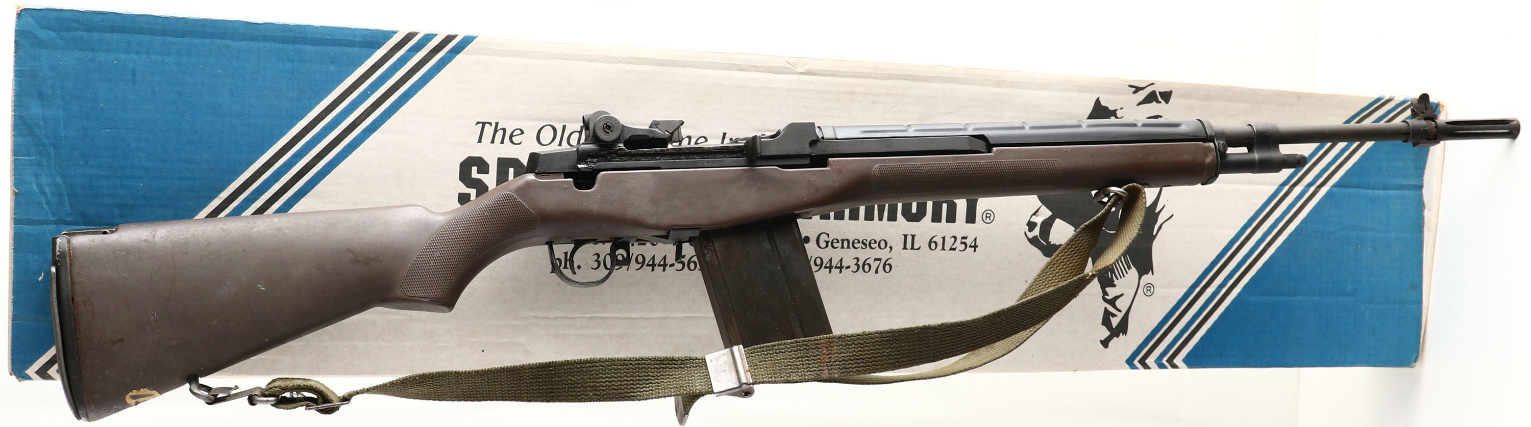BOXED, Springfield, U.S Rifle M1A, CAL: 7.62x51 (308), MFG: 1996, Semi Auto Rifle, 25'' barrel. The original checkered flat pistol grip stock is very good & solid. The right side of the forend has a small crack along with age soiling & light overall wear. The heat shield is excellent. The parkerized finish is very good, with intermittent spotting & speckling. Bore is excellent. Factory sights. Hinged & trapdoor buttplate. Comes with correct sling & mag. The metal components on the sling & the mag have some standing rust from poor storage. Comes with factory box. FFL Req. - Value: 1000 to 2000