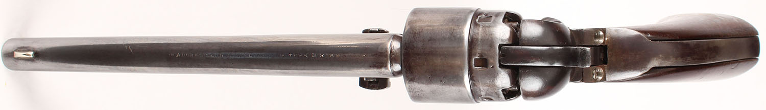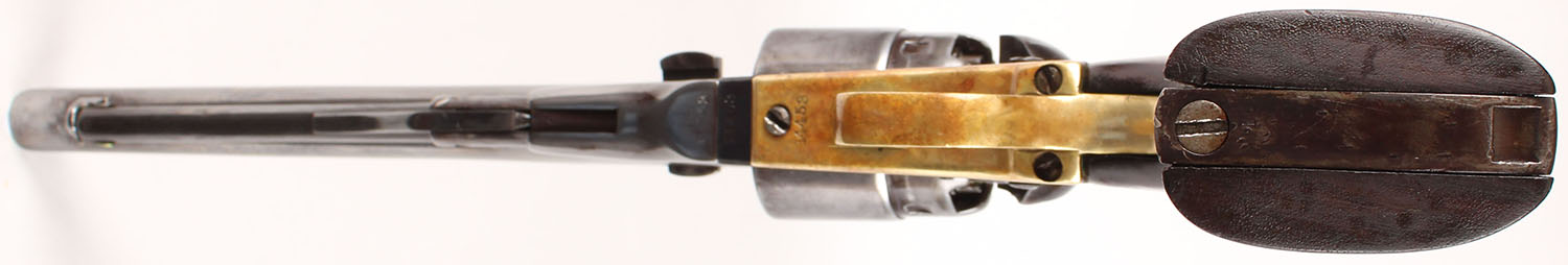 Colt, Model 1860 Army, CAL: 44, MFG: 1861, SN: 14453, Single Action Percussion Revolver, 8'' barrel. Civil War Era. The top of the barrel has a worn roll-stamp that reads: ''ADDRESS COL. SAM L COLT NEW-YORK U.S AMERICA'' & ''COLTS PATENT'' is faintly stamped on the left side of the frame. No visible caliber marking. The Naval scene on the cylinder is not visible. All matching SN on the barrel housing, frame, trigger guard, wedge & arbor. There is a non-legible cartouche behind the trigger guard (maybe a ''D'') & a ''C'' stamped on the top of the backstrap. The replaced wood grips are very good & solid having been sanded, refinished. There are contusions, dings, visible striations & thinned applied finish. The metal finish is a mix of metal gray & brown patina. The barrel & cylinder have been buffed & polished. The brass trigger guard has an orange/aged patina. Bore is good, with roughness & pitting amongst strong rifling. Small blade front sight. Antique, No FFL Req. - Value: 800 to 1400