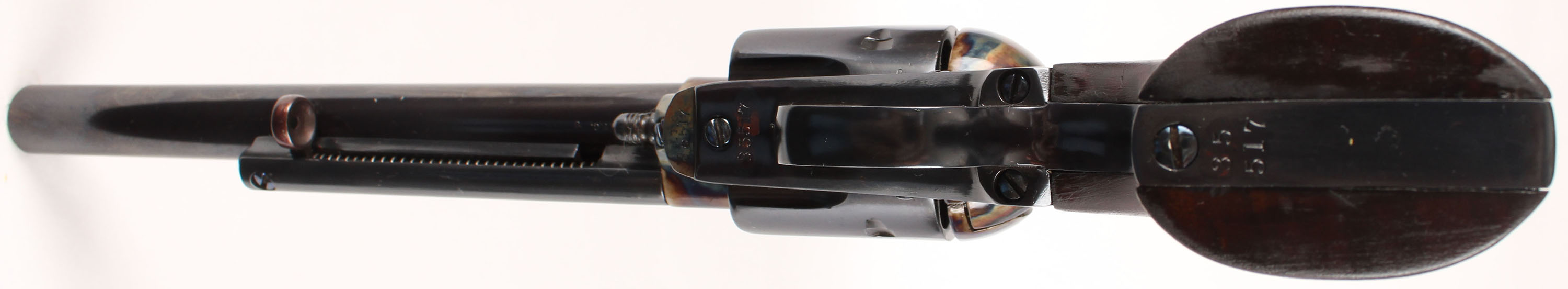 Colt, First Gen Single Action Army U.S Marked, CAL: 45 COLT, MFG: 1877, SN: 35517, Single Action Revolver, 7 1/2'' barrel. This gun has been fully & professionally restored. All matching SN on the butt, trigger guard, frame & cylinder. The inspector initials ''J.T.C'' can be found on the frame above the SN, bottom of barrel & cylinder. There are two cartouches on the left grip, ''1877'' over an upside-down cursive ''JH'' cartouche in a square. The right grip has the same right side up cursive ''JH'' cartouche. The cartouches are thin from the grips being refinished, but are still very legible. The top of the barrel has a one line address ''COLT'S PT. F. A. MFG CO HARTFORD, CT. U.S.A''. The left side of the receiver has a two line patent date ''PAT.SEPT.19.1871, JULY2.72, JAN.19.75'' & a ''U.S'' marking. The markings on the frame appear thin. The cylinder has a partial matching SN. The full SN can be found on the frame. The original wood grips are excellent, having been lightly sanded & refinished. The metal blue finish on the barrel & cylinder rates 97%. The case-hardened receiver & hammer display bright case colors. Bore is excellent, with mirrored appearance. V-notch rear groove & tall blade front sight. Comes with a Colt Factory letter. The records on this revolver do not provide the barrel length or type of stock, they label it as ''Not Listed'', however there is a ''Remarks'' paragraph below the record that states: ''As noted above, the records do not provide information with regard to the barrel length of revolver or the type of stocks. However, this is usually an indication of a 7 1/2'' barrel length and walnut stocks as these were considered standard issue for that time period.''. This revolver still presents excellently having been professionally restored. No FFL Req. - Value: 2000 to 6000