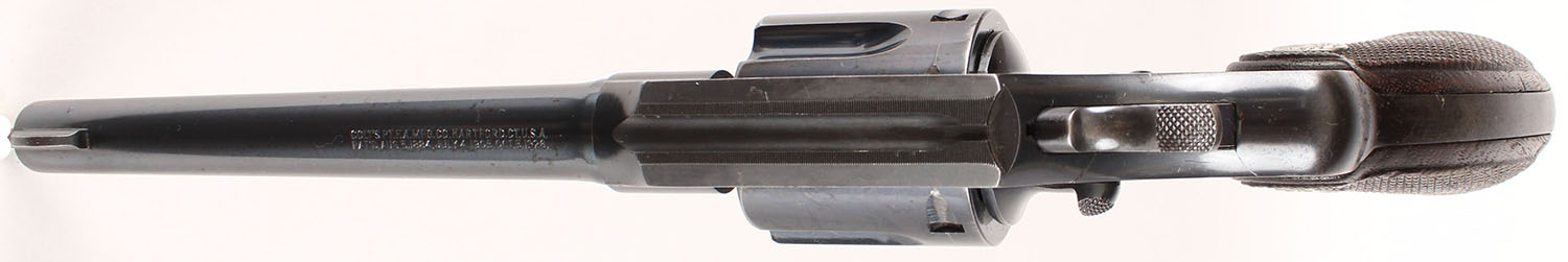 Colt, Official Police Pre-War, CAL: 22LR, MFG: 1939, SN: 13808, Double Action Revolver, 6'' barrel. The Colt logo medallion pre-war checkered walnut grips are very good & solid. There is consistent overall wear to the grips. Confirmed pre-war grips by the three stud holes visible on the reverse top of both grip panels. The original metal blue finish rates 85% overall, with spotting/speckling toned to a brown patina. Bore is excellent. Square notch rear groove & blade front sight. A desirable .22LR variation of an Official Police Revolver. FFL or C&R Req. - Value: 500 to 900