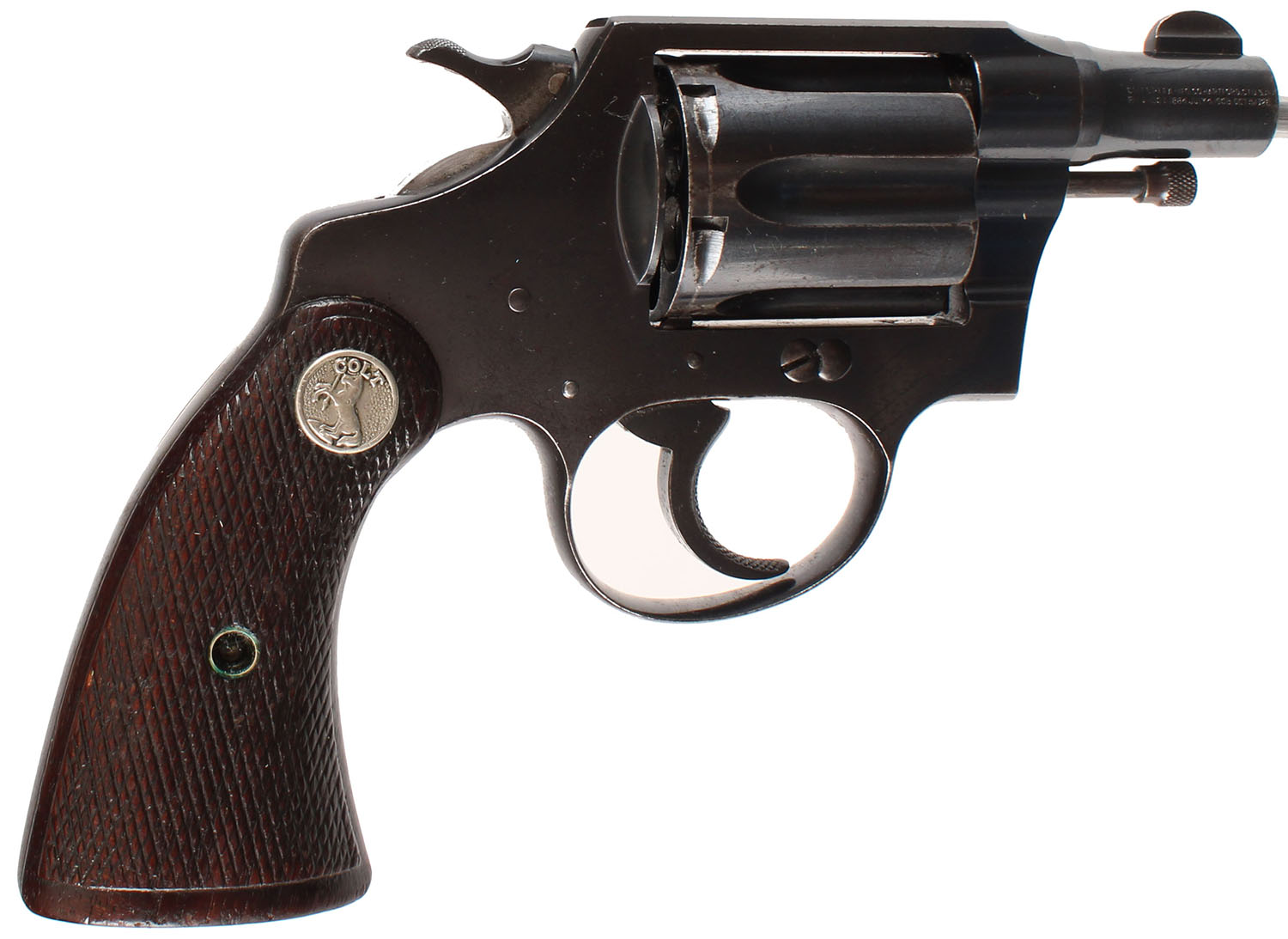 Colt, Detective Special Pre-War 1st Issue, CAL: 38 SPL, MFG: 1932, SN: 410140, Double Action Revolver, 2'' barrel. The original Colt medallion two-piece checkered wood grips are excellent. There are dings, scrapes & the checkering is beginning to wear smooth. The original metal blue finish rates 85% on the barrel, cylinder & frame, with additional wear to the straps. Bore is excellent. Square notch rear sight & blade front sight. FFL or C&R Req. - Value: 900 to 1600