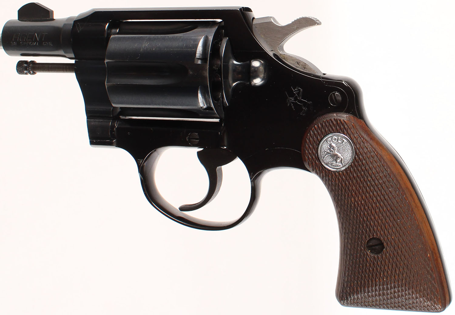 BOXED, Colt, Agent, First Issue, CAL: 38 SPL, MFG: 1962-72, SN: 156724, Double Action Revolver, 2'' barrel. The silver Colt medallion checkered wood grips are mint. The original Colt high polish metal blue finish rates 100% overall. No drag line. Bore is mint. Never been fired. Factory sights. Comes in original, correct label wood grain box, with original wax paper & insert. Box is very good, with edge & corner wear. These revolvers are similar to the Colt Cobra first issue, except with a shorter grip frame. This example is one of, if not the highest condition Colt Agent revolver we've seen. FFL or C&R Req. - Value: 1000 to 2000