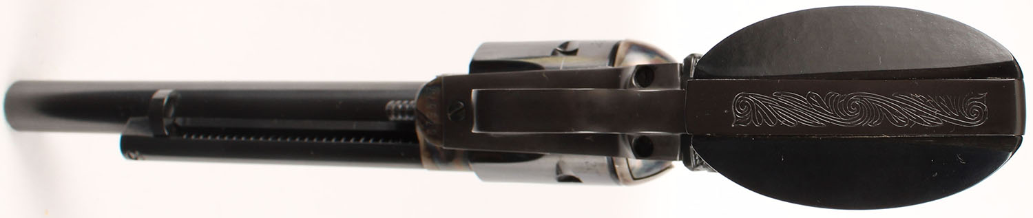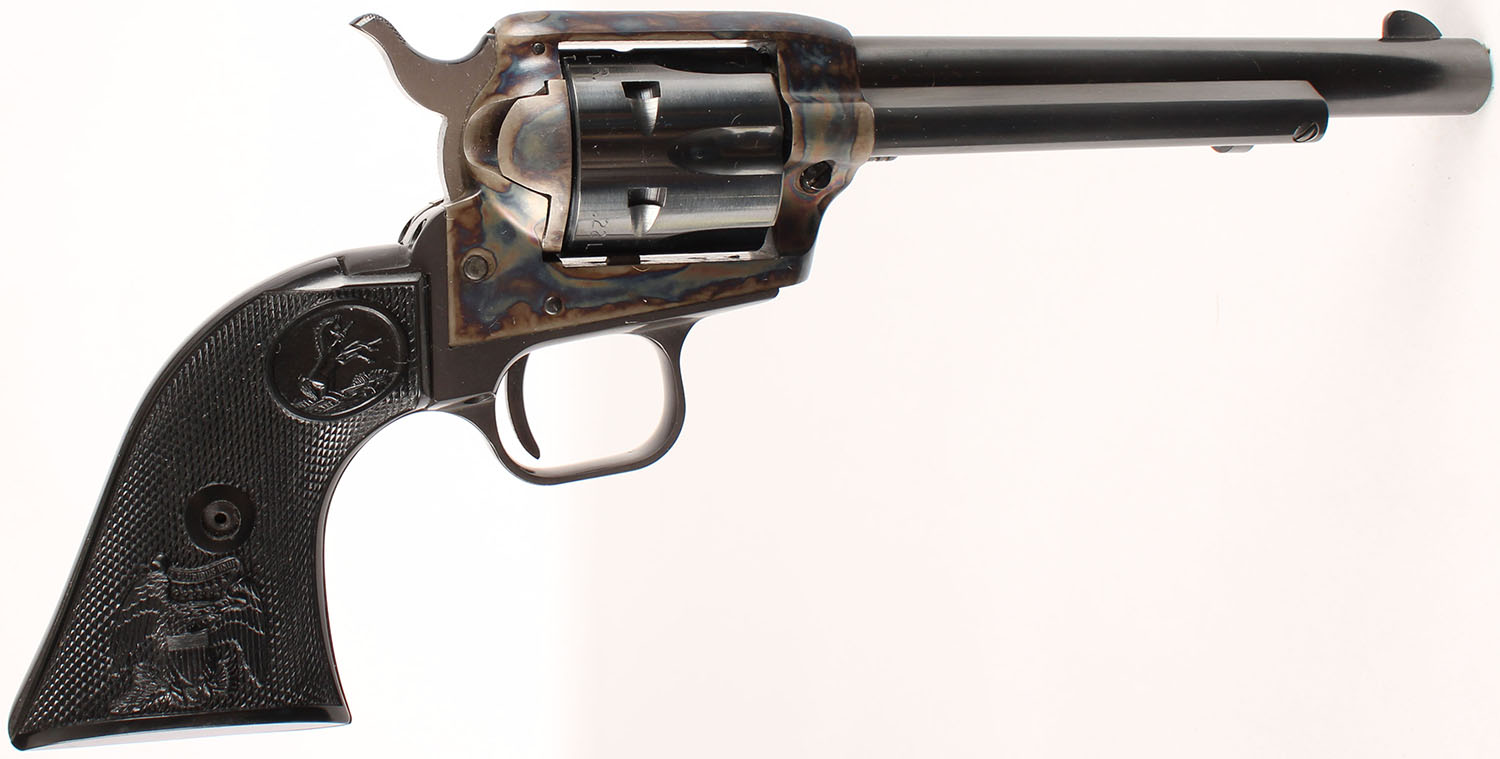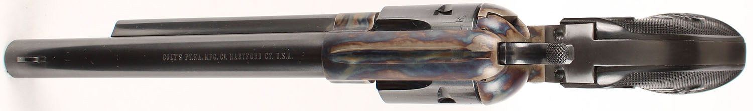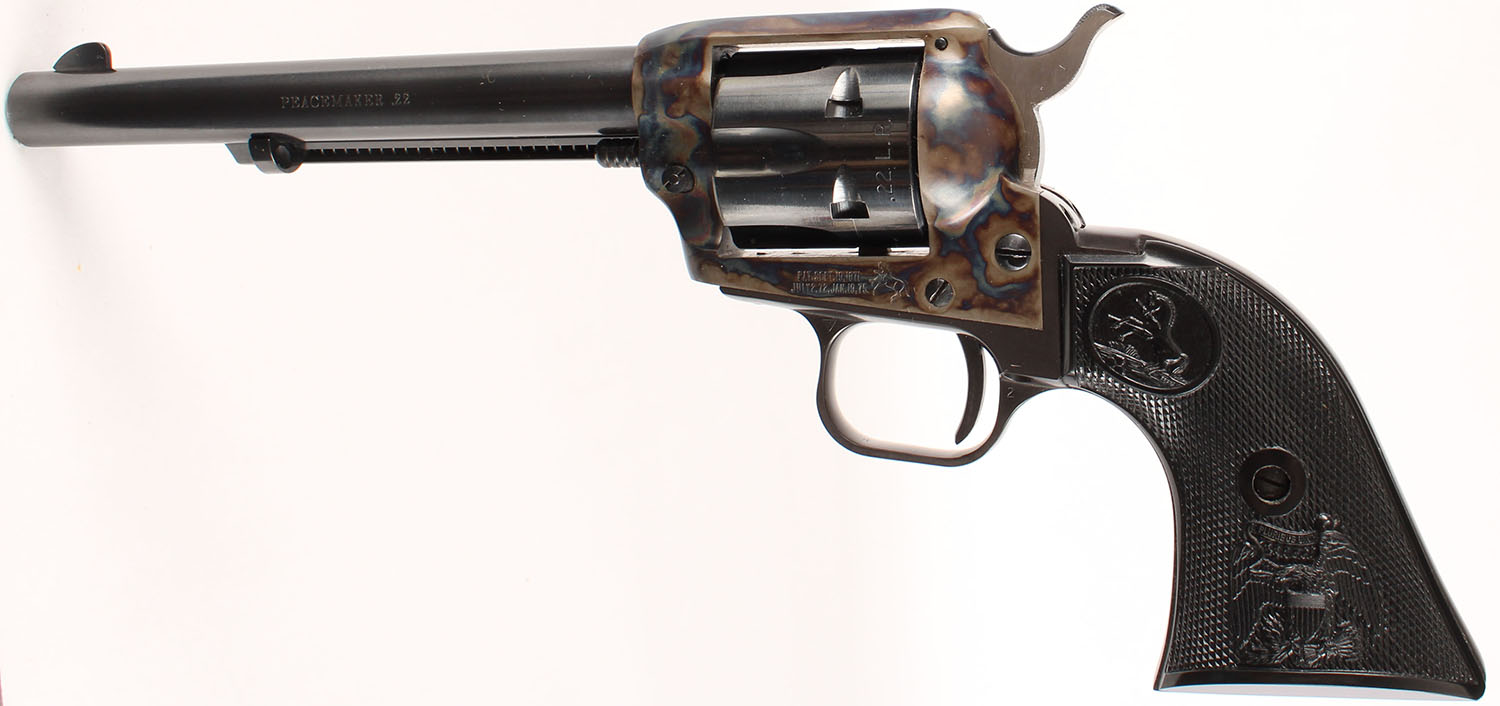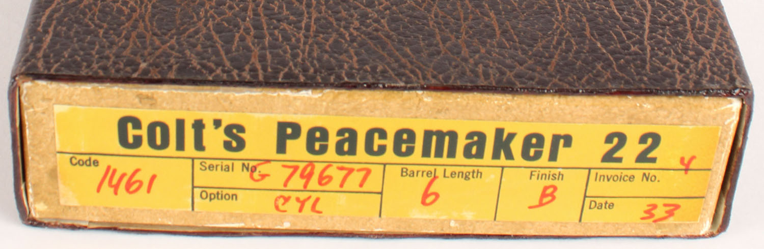NEW, BOXED, Colt, Peacemaker 2nd Gen, CAL: 22LR/22WMR, MFG: 1973, SN: G79677, Single Action Revolver, 6'' barrel. The top of the barrel is marked ''COLT'S PT F.A. MFG. CO. HARTFORD CT. U.S.A.''. The left side of the barrel is marked ''PEACEMAKER 22''. The left side of the frame is marked with the Rampant Colt logo above the trigger guard & next to patent dates. The full SN can be found on the bottom of the frame. The original Rampant Colt & E.Pluribus Unum Eagle plastic grips are excellent. The factory metal blue finishes rate 99%+. The case-hardened frame displays vivid case-colors. Bore is excellent & bright. Factory groove & blade front sight. Comes in the original factory box, with correct label, leatherette outer cardboard sleeve, 22 WMR cylinder in original box & original wax paper. Box condition is excellent. FFL Req. - Value: 800 to 1200