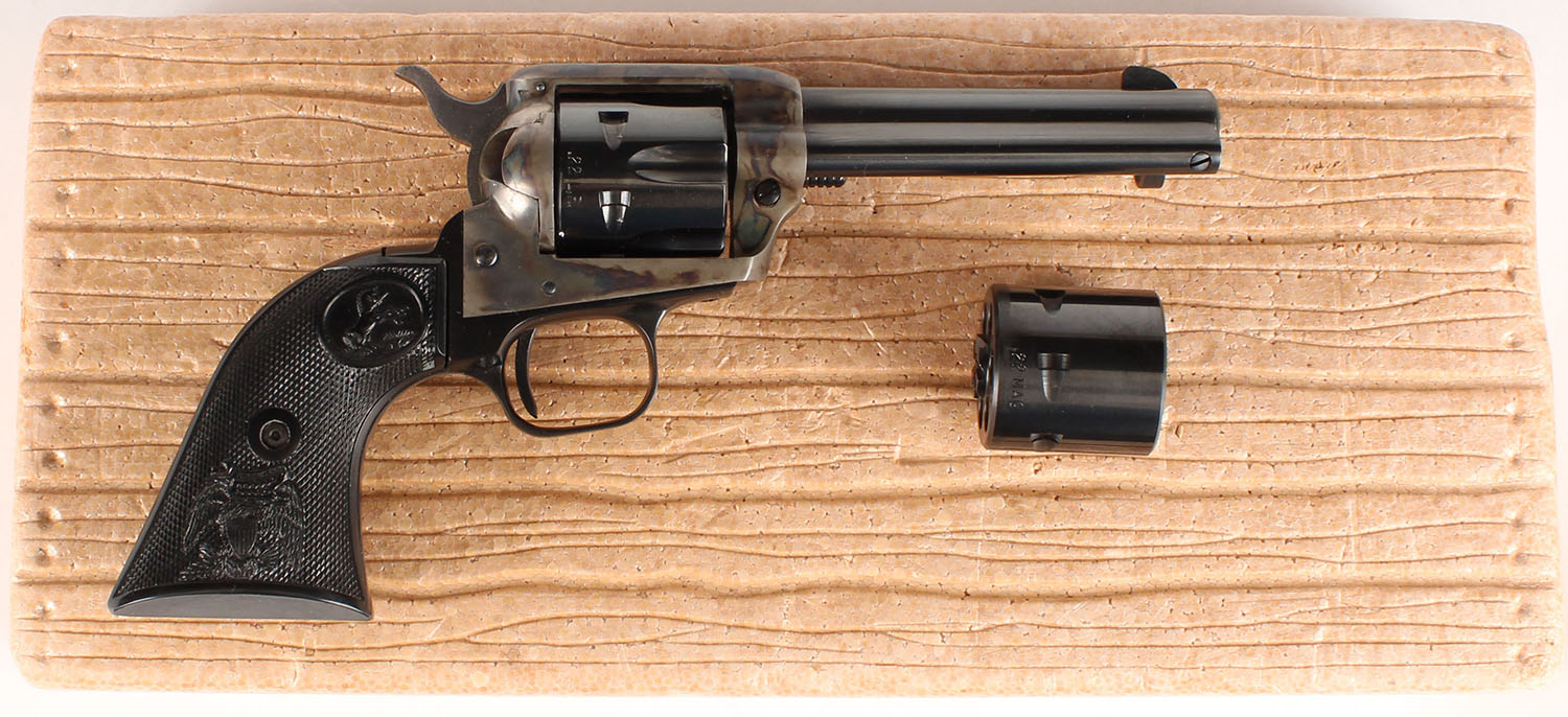 Colt, Peacemaker, CAL: 22 LR/22 MAG, MFG: 1974, SN: G112761, Single Action Revolver, 4 3/8'' barrel. The original E. Pluribus Unum & Rampant Colt checkered plastic grips are excellent. The metal blue finish on the barrel & cylinder rates 99%. The case-hardened frame displays vivid case-colors. The case-colors on the right side of the frame have slightly faded. Bore is excellent. Rear groove & blade front sight. Comes in the original Colt styrofoam packaging, no cardboard box. Included is the 22 MAG cylinder in original packaging. FFL or C&R Req. - Value: 600 to 1000