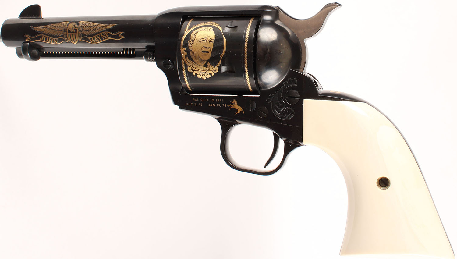 Cased Colt SAA John Wayne Commemorative, 45 LC Cal, Model John Wayne SAA, MFG: modern, SN: CJWC0198, Barrel 4 5/8'', smooth white grips are minty, engraved factory blue finish is mint, has gold engraved barrel, cylinder & receiver, NIB, wood case is red leather lined with gold key & plaque, great new old stock NIB. FFL Req. - Value: 2000 to 5000