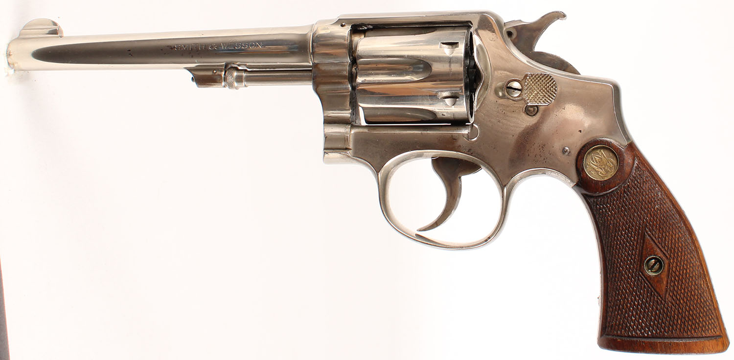 Smith & Wesson, .32-20 Hand Ejector Model of 1905 4th Change, CAL: 32 WCF, MFG: 1915-25, SN: 86364, Double Action Revolver, 6'' barrel. All matching SN on the butt, cylinder face & bottom barrel flat. There is a two line address & patent date on the top of the barrel. The left side of the barrel is marked ''SMITH & WESSON'' & the right side of the barrel is marked ''.32 WCF CTG''. There are no markings on the frame. The S&W brass logo medallion checkered wood grips are excellent. There are minor dings & scrapes to the finish. The nickel finish rates 85% overall. There are areas of oxidization, with spotting/speckling toned to a brown patina. The case-hardened hammer & trigger retain visible case-colors. Bore is very good & bright, with rough patches. Rear groove & blade front sight. This example has the heat treated cylinder, this change started at SN 81287. S&W handguns chambered in .32-20 were discontinued prior to WWII & were never resumed. FFL or C&R Req. - Value: 500 to 1000