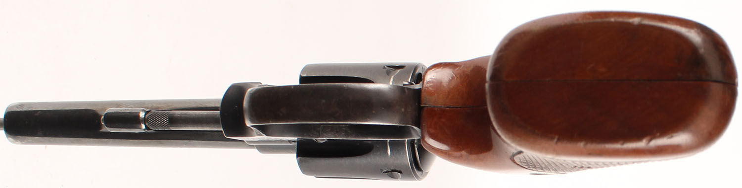 Smith & Wesson, Model of 1953 .22/32 Kit Gun ''Pre Model 34'', CAL: 22LR, MFG'' 1953-57, SN: 10678, Double Action Revolver, 4'' barrel. The S&W logo medallion checkered wood grips are excellent. There are handling marks & light wear to the finish. The metal blue finish rates 85% overall. Bore is excellent, with areas of visible roughness. Adjustable rear sight & serrated blade front sight. This revolver was continued as the Model 34 in 1957. FFL or C&R Req. - Value: 500 to 1000