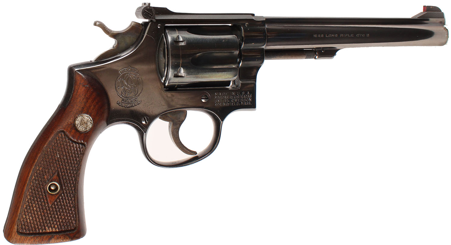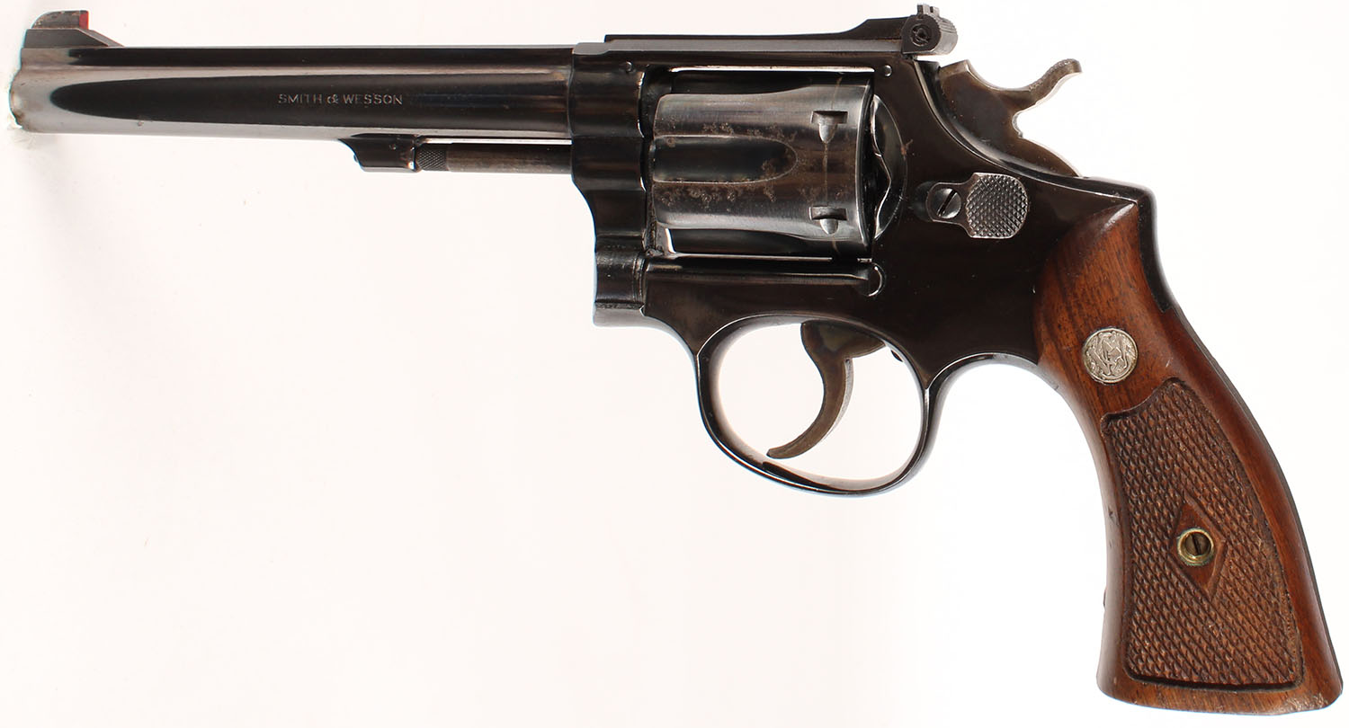 Smith & Wesson, K-22 Masterpiece Postwar 3rd Model ''Pre-Model 17'', CAL: 22LR, MFG: 1956, SN: K 269779, Double Action Revolver, 6'' barrel. The S&W logo medallion checkered wood grips are excellent. There are nicks & dings to the finish. The metal blue finish rates 85% overall, with consistent light speckling & spotting. There is light pitting on the cylinder, worn to metal gray & toned to a brown patina. The case-hardened trigger & hammer retain visible case colors. Bore is excellent. Adjustable rear sight & elevated serrated blade front sight. FFL or C&R Req. - Value: 500 to 800