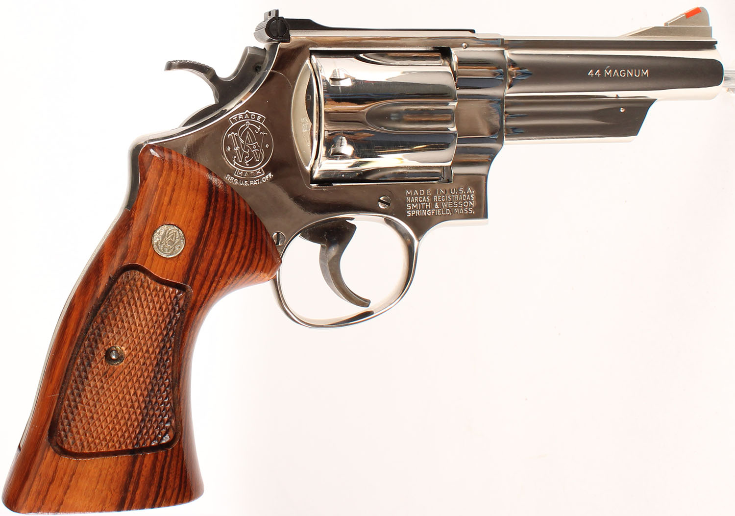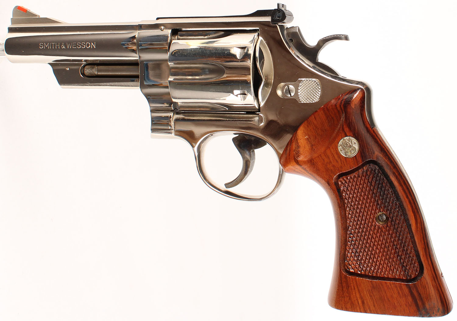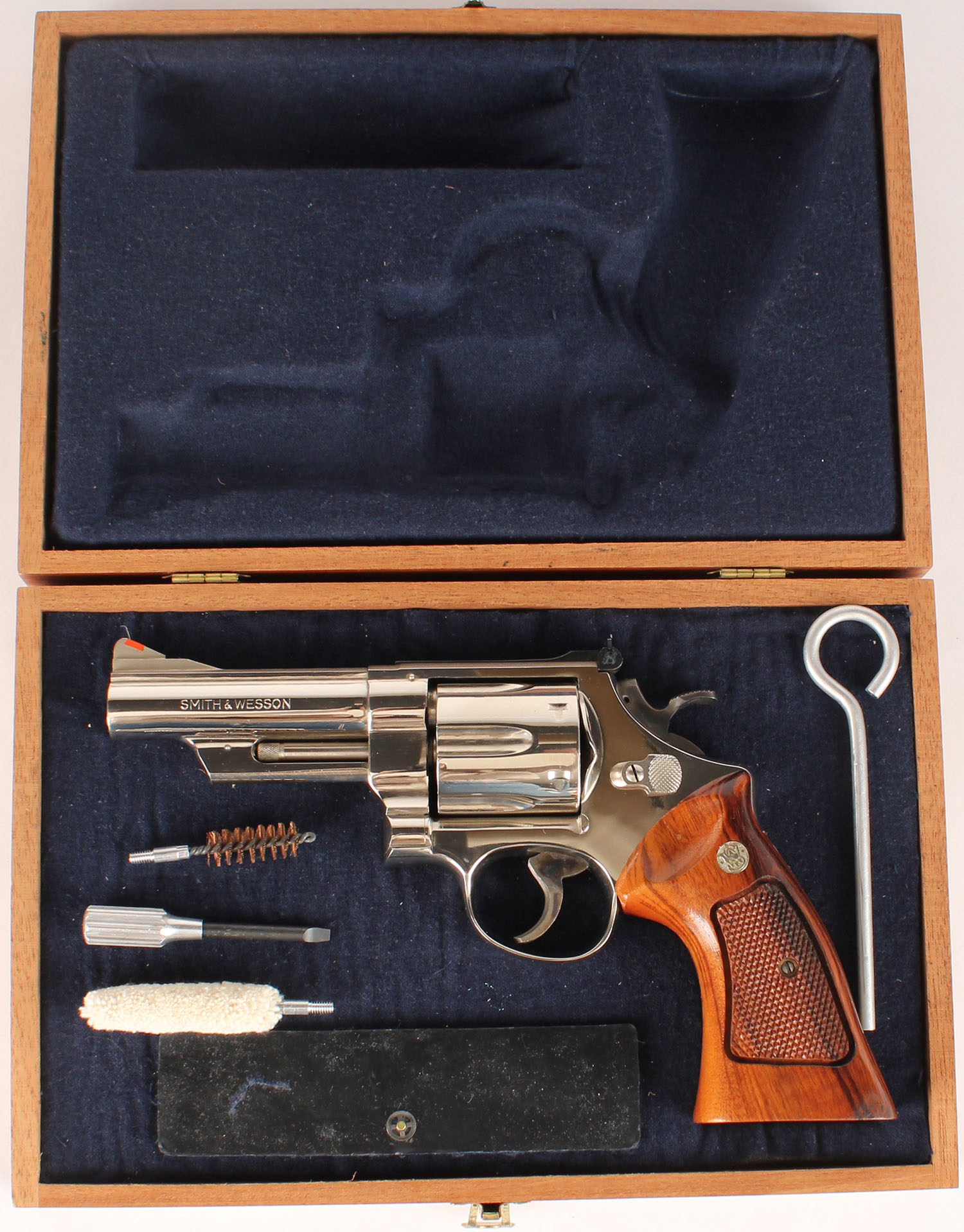 CASED, Smith & Wesson, Model 29-2 3 Screw, CAL: 44 MAG, MFG: 1980, SN: N791874, Double Action Revolver, 4'' barrel. The S&W logo medallion checkered wood grips are excellent. The original nickel finish is excellent, with visible brush lines, consistent with nickel finishes. Bore is excellent. Adjustable rear sight & serrated blade front sight with orange insert. Comes in wood presentation case, with tool & cleaning components. FFL Req. - Value: 1500 to 2500