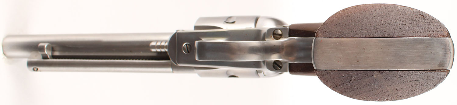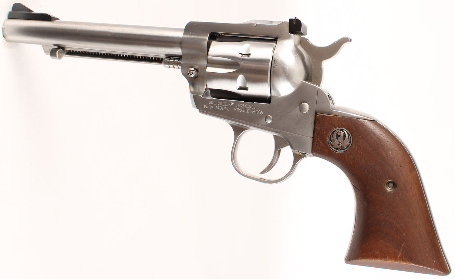 Ruger, New Model Single Six, CAL: 22 LR, MFG: 1974-75, SN: 62-72277, Single Action Revolver, 5 1/2'' barrel. The Ruger logo medallion wood grips are excellent. There are handling marks, scrapes & dings. The stainless steel finish is excellent, with light scuffs, & a few small areas of spotting. Bore is excellent. Adjustable rear sight & block elevated blade front sight. FFL Req. - Value: 400 to 700