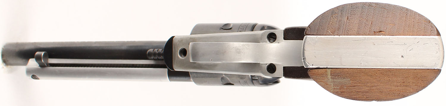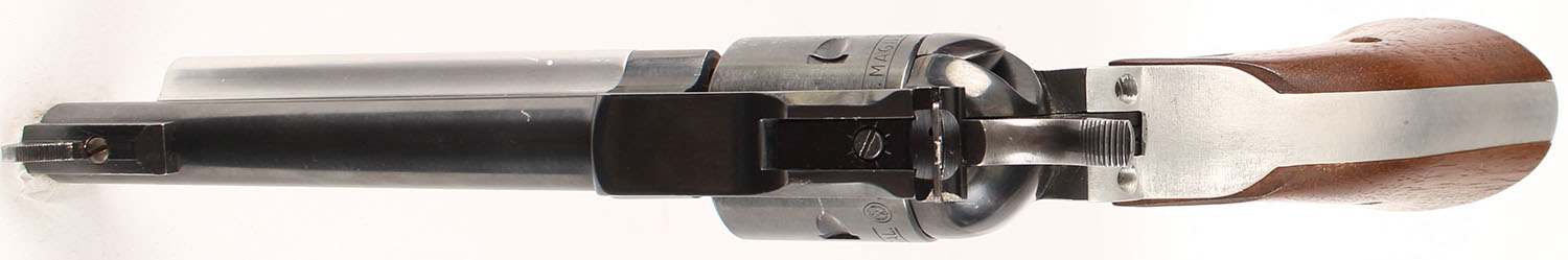 Ruger, New Model Single Six, CAL: 22 MAG, MFG: 1983, SN: 69-83982, Single Action Revolver, 5 1/2'' barrel. The Ruger logo medallion wood grips are very good. There is a repaired break on the right grip along with other contusions, scrapes & dings. The metal blue finish on the barrel rates 90%, with cleaned pitting worn to metal gray & toned to a brown patina. The frame rates 90% & the cylinder rates 90%, with cleaned spotting worn to metal gray & toned to a brown patina. The ejection rod housing & grip frame are replaced with aluminum parts. Bore is excellent, with roughness near the muzzle. Adjustable rear sight & block elevated serrated blade front sight. FFL Req. - Value: 150 to 350