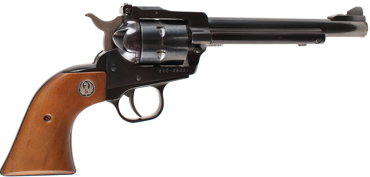 Ruger, New Model Single Six, CAL: .22LR, MFG: 1984, SN: 260-25334, Single Action Revolver, 6 1/2'' barrel. The Ruger logo medallion wood grips are excellent. There are minor storage marks to the finish. The metal blue finish rates 97% overall. Bore is excellent. Adjustable rear sight & block elevated serrated blade front sight. FFL or C&R Req. - Value: 400 to 800
