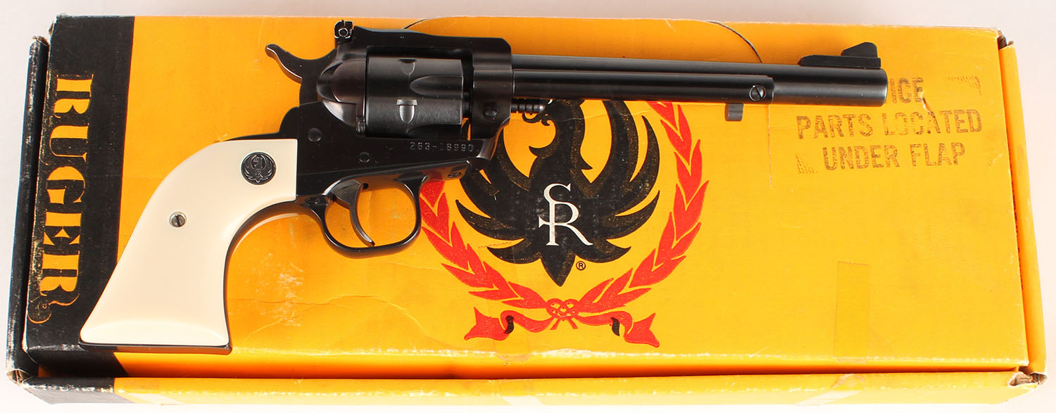 Ruger, New Model Single Six, CAL: 22LR, MFG: 1996, SN: 263-18990, Single Action Revolver, 6 1/2'' barrel. The Ruger logo medallion faux ivory grips are excellent. The metal blue finish rates 98% overall. Bore is excellent. Adjustable rear sight & elevated serrated blade front sight. Comes in period correct box, no label. FFL Req. - Value: 400 to 700