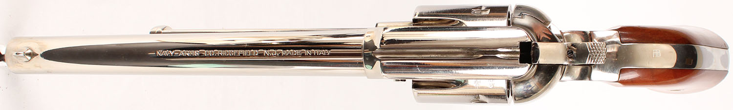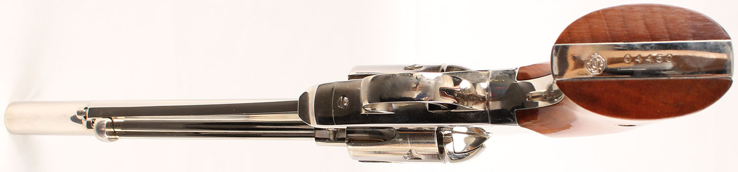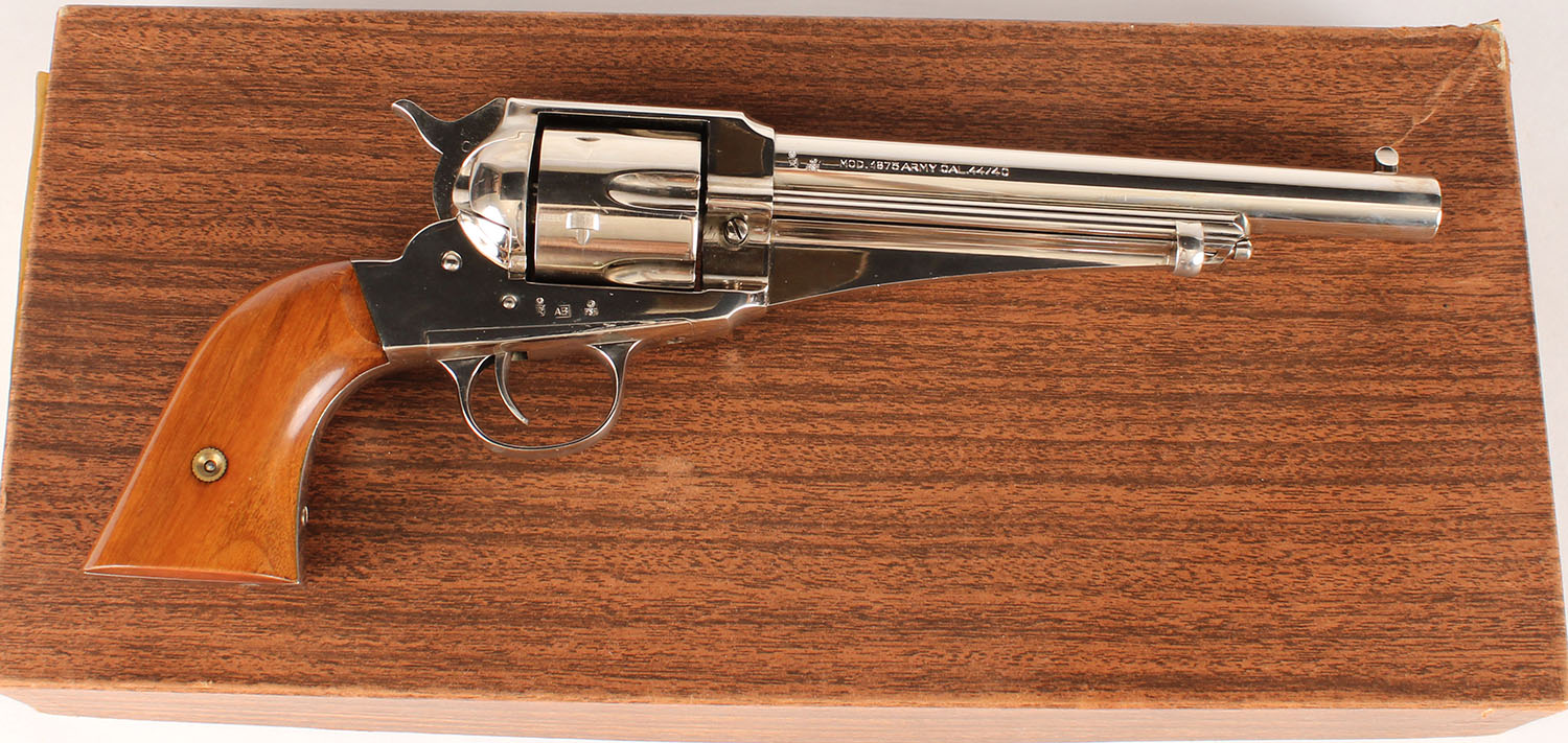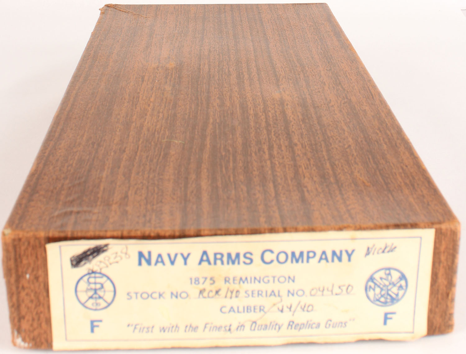BOXED, Navy Arms, Remington Model 1875 Army Replica, CAL: 44-40, MFG: Modern, SN: 04450, Single Action Revolver, 7 1/2'' barrel. The wood grips are excellent. There are a couple minor handling marks. The nickel finish is excellent, there are visible striations & small areas of oxidization or dull areas, but no loss. Bore is excellent. Groove & post sights. Comes in original wood grain SN matching box. Box is very good, with light corner/edge wear & one split corner. FFL Req. - Value: 300 to 600