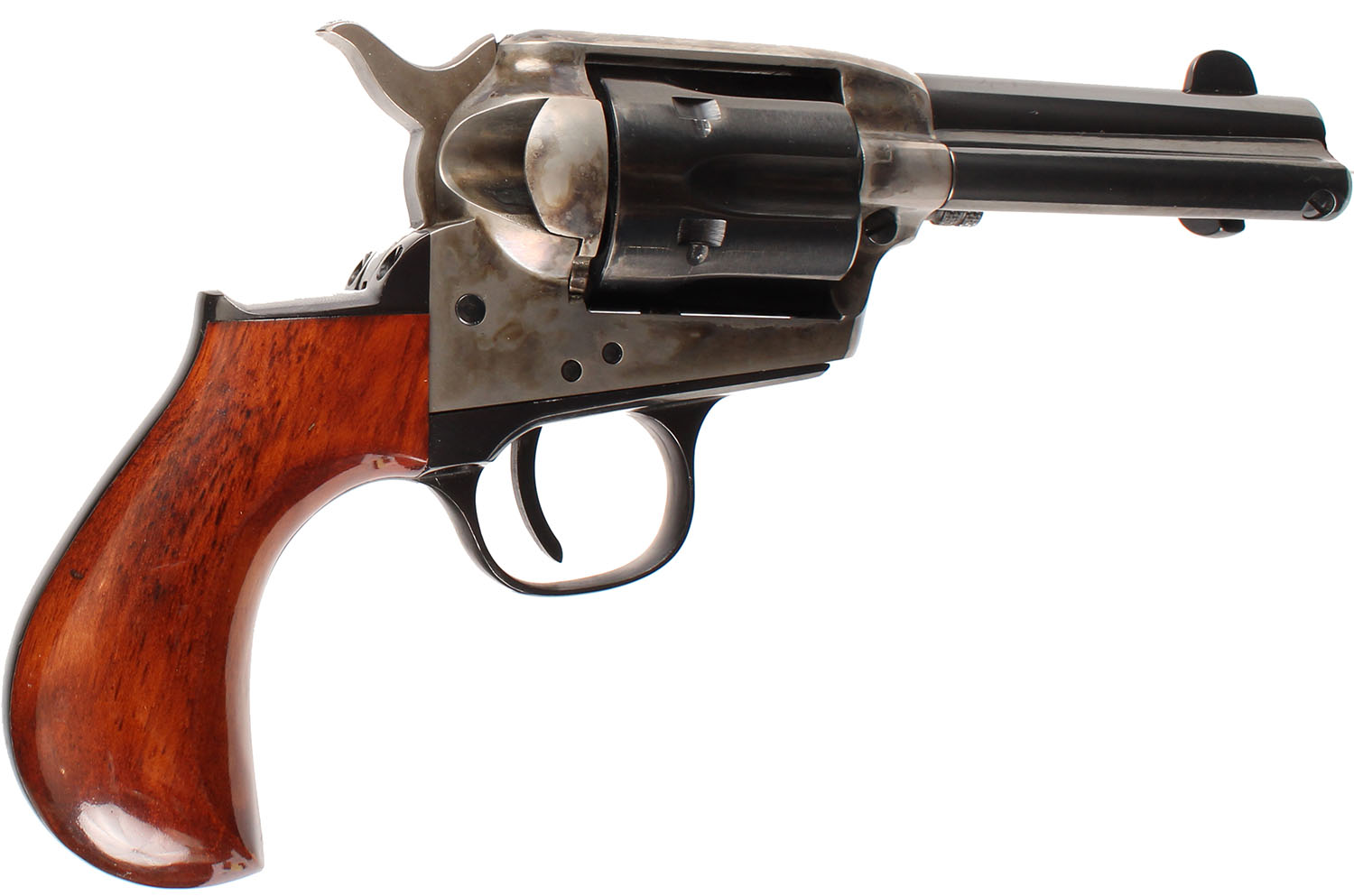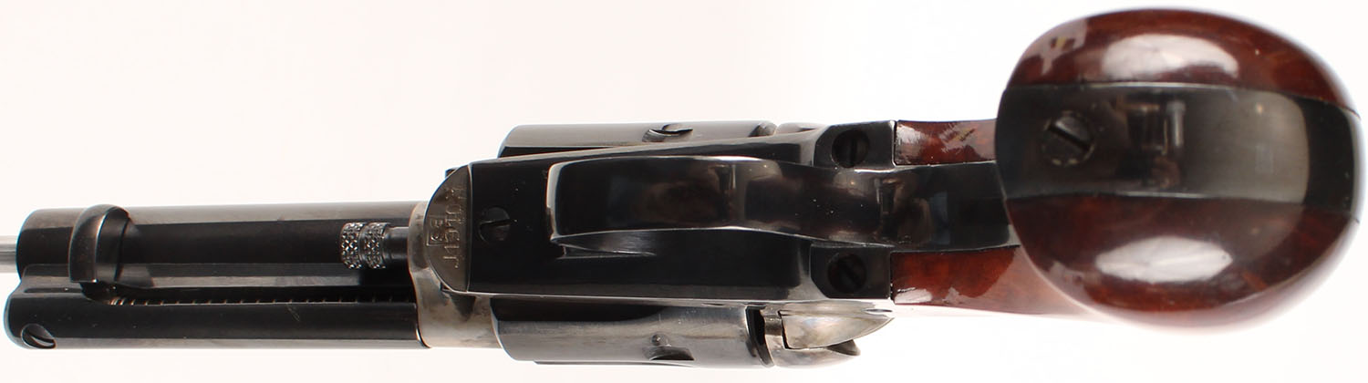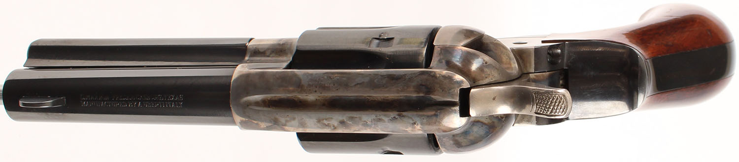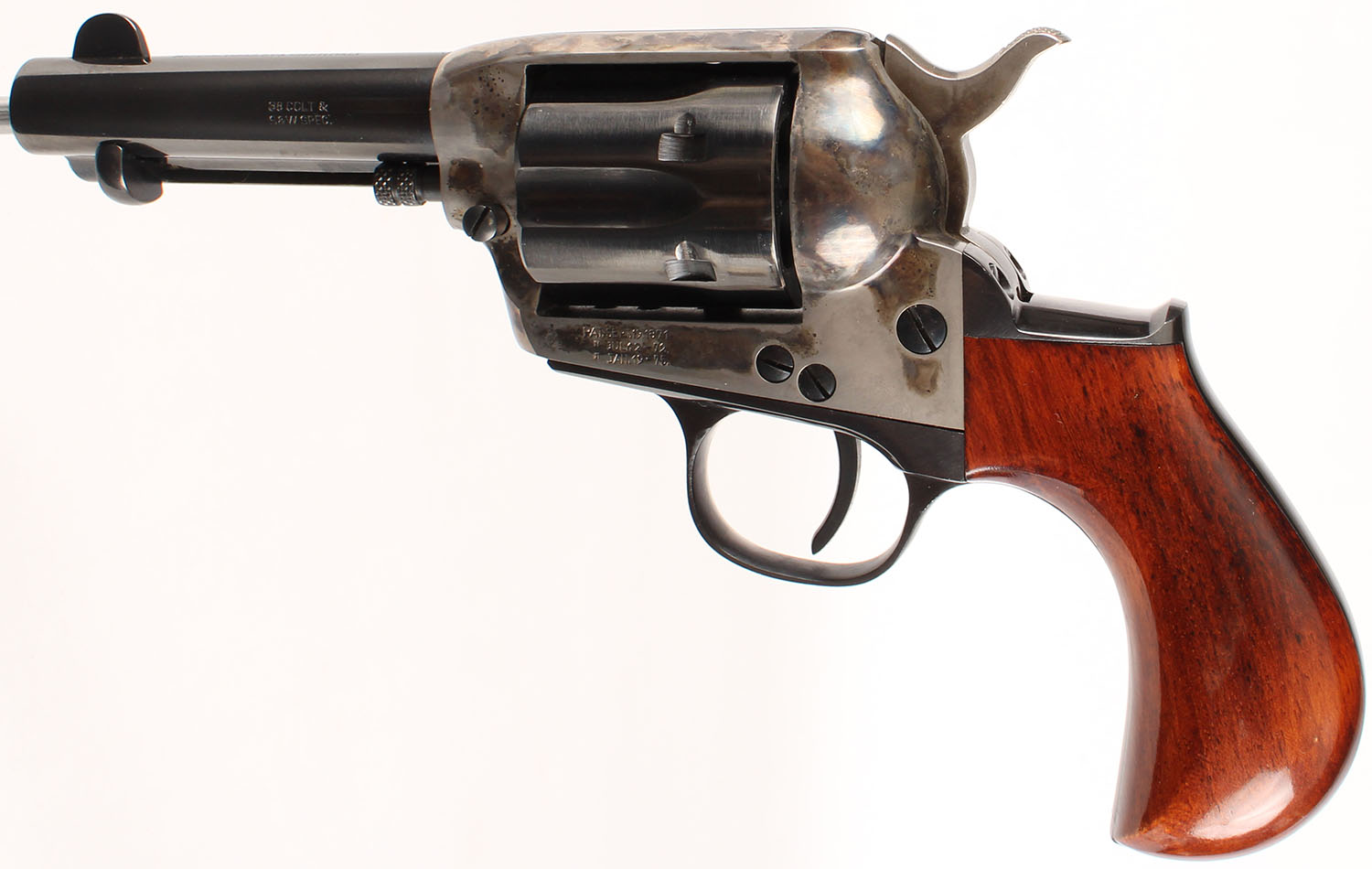 Uberti (Cimarron), Lightning, CAL: 38 COLT & S&W SPL, MFG: Modern, SN: J19103, Single Action Revolver, 3 1/2'' barrel. The birds head wood grips are excellent. The metal blue finish on the barrel & cylinder rates 98% & the case-hardened frame retains faint case-colors, mostly shadowing. Bore is excellent. Groove & blade sights. From Cimarron Website: Designed along the lines of the classic Colt 1877 double-action revolver with its distinctive birds head grip--the '77 Colt model was a favorite with such Old West characters as Billy the Kid, John Wesley Hardin and lady outlaws Calamity Jane and Pearl Hart. Cimarron has improved this handsome small-framed revolver by maintaining the grace and beauty of the 19th century model, but in a much more reliable and durable six-gun than the 19th century model. FFL Req. - Value: 400 to 700