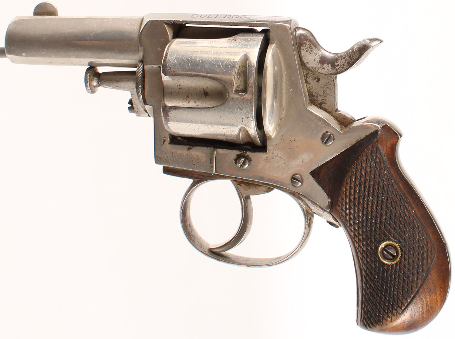 Belgian ''British Bulldog'', CAL: marked 44, MFG: 1870's-early 1890's, SN: N/A, Double Action Revolver, 2 1/2'' barrel. The top of the frame is marked ''BRITISH BULLDOG'', the right side is marked ''44'' over ''Star/X'' proof mark & the face of the cylinder is marked with '''44'', ''Star/X'' & Leige 1811-1892 proof mark. The checkered bird head wood grips are excellent. There are minor handling marks, with slightly worn checkering. The nickel finish rates 80% overall, with areas worn to metal grey & toned to a brown patina. Bore is good, with consistent roughness. The barrel holds a small half-moon blade front sight. Antique, No FFL Req. - Value: 300 to 600