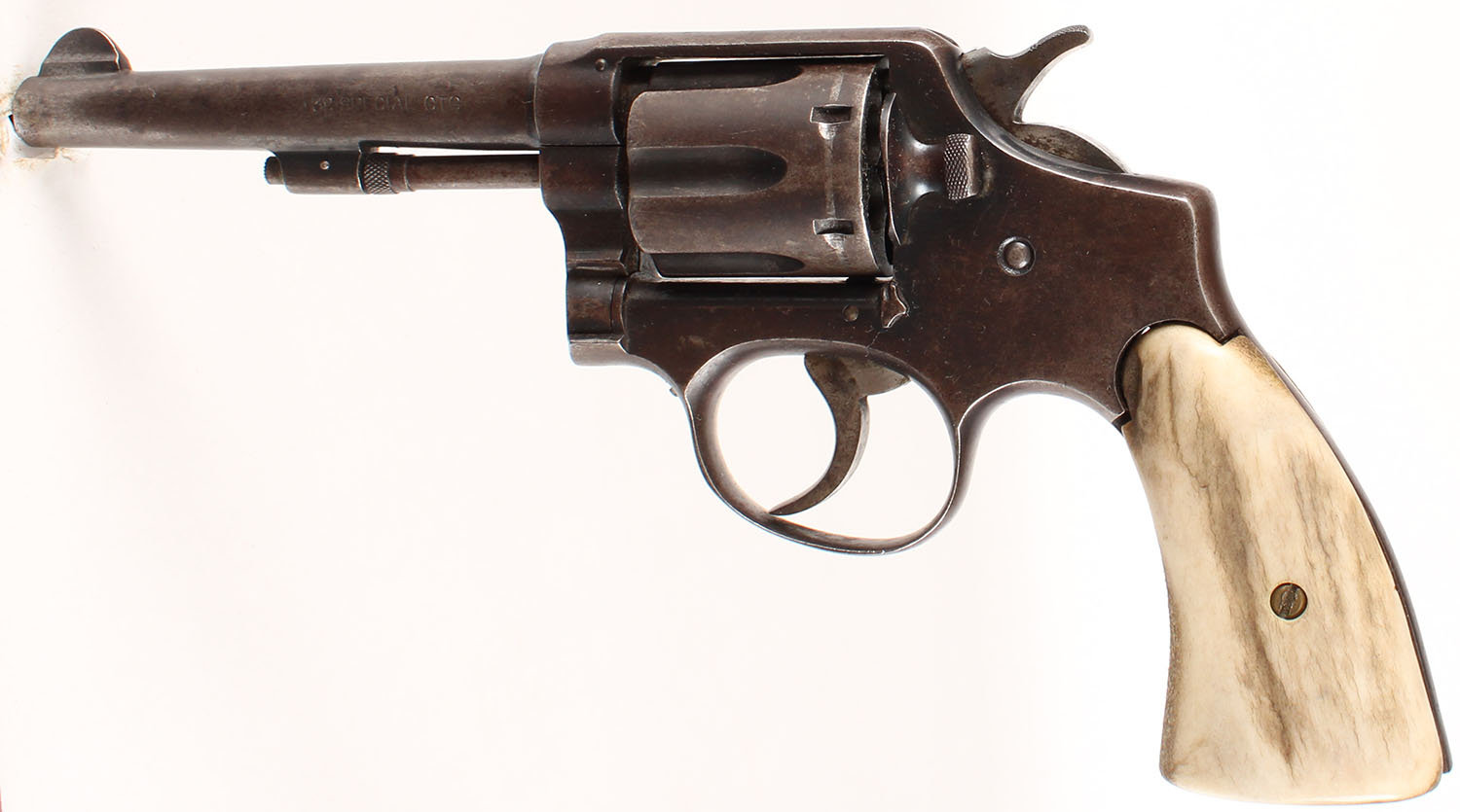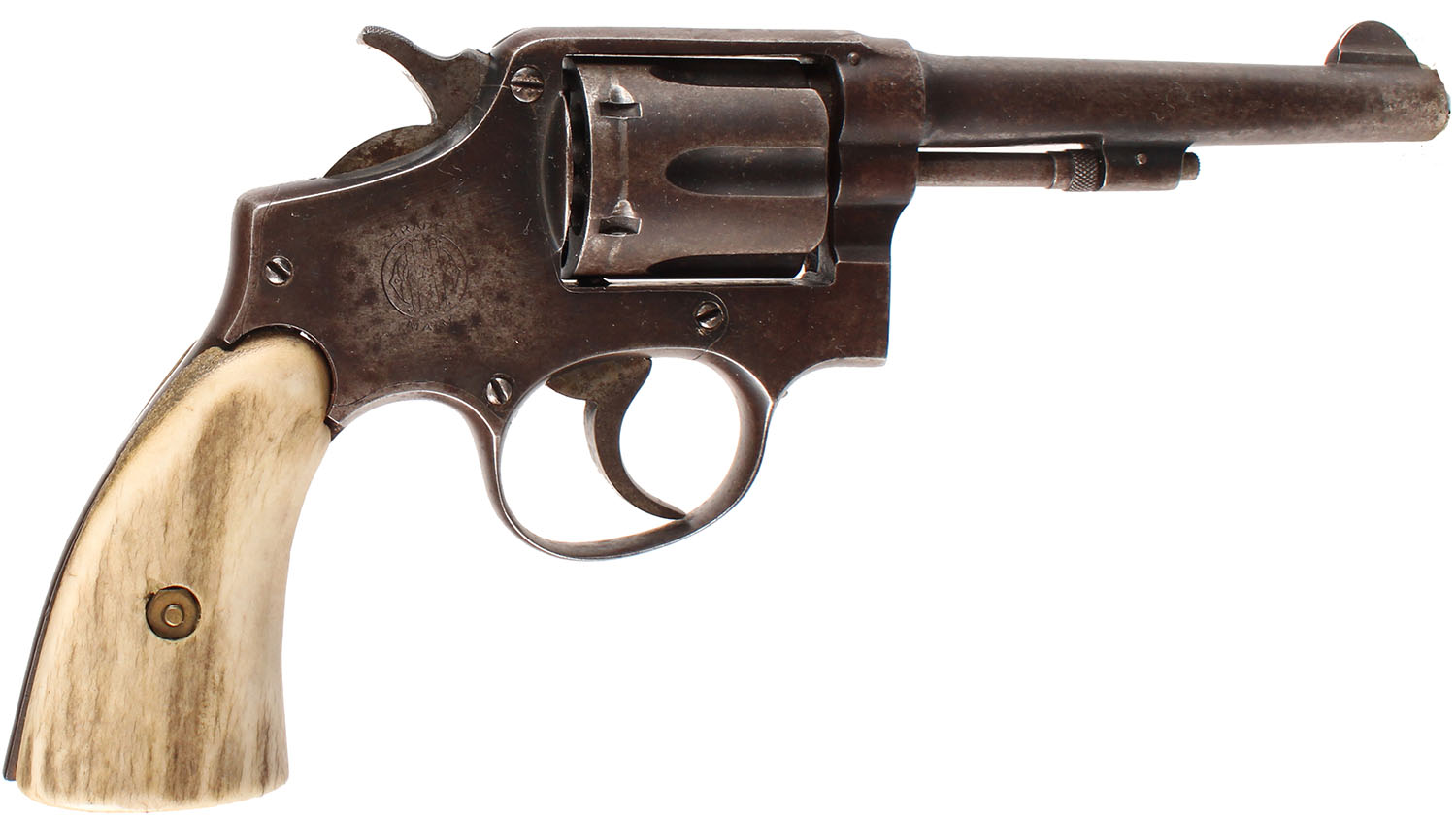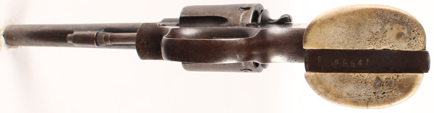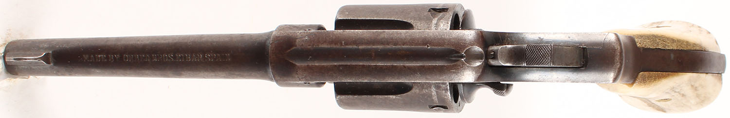 Orbea Bros (Spain), Model N/A, CAL: .38 SPL, MFG: 1920's, SN: E65541, Double Action Revolver, 4 7/8'' barrel. The antler/horn grips are very good. They are aged, but solid & the fit is slightly off. The metal finish has worn to a mix of metal gray & brown patina, with original blue remaining in heavily protected areas. Bore is good with intermittent pitting & roughness. Groove & blade sights. Orbea Hermanos made a variety of revolvers that externally resembled various Colt or S&W models of the same era. FFL or C&R Req. - Value: 100 to 200