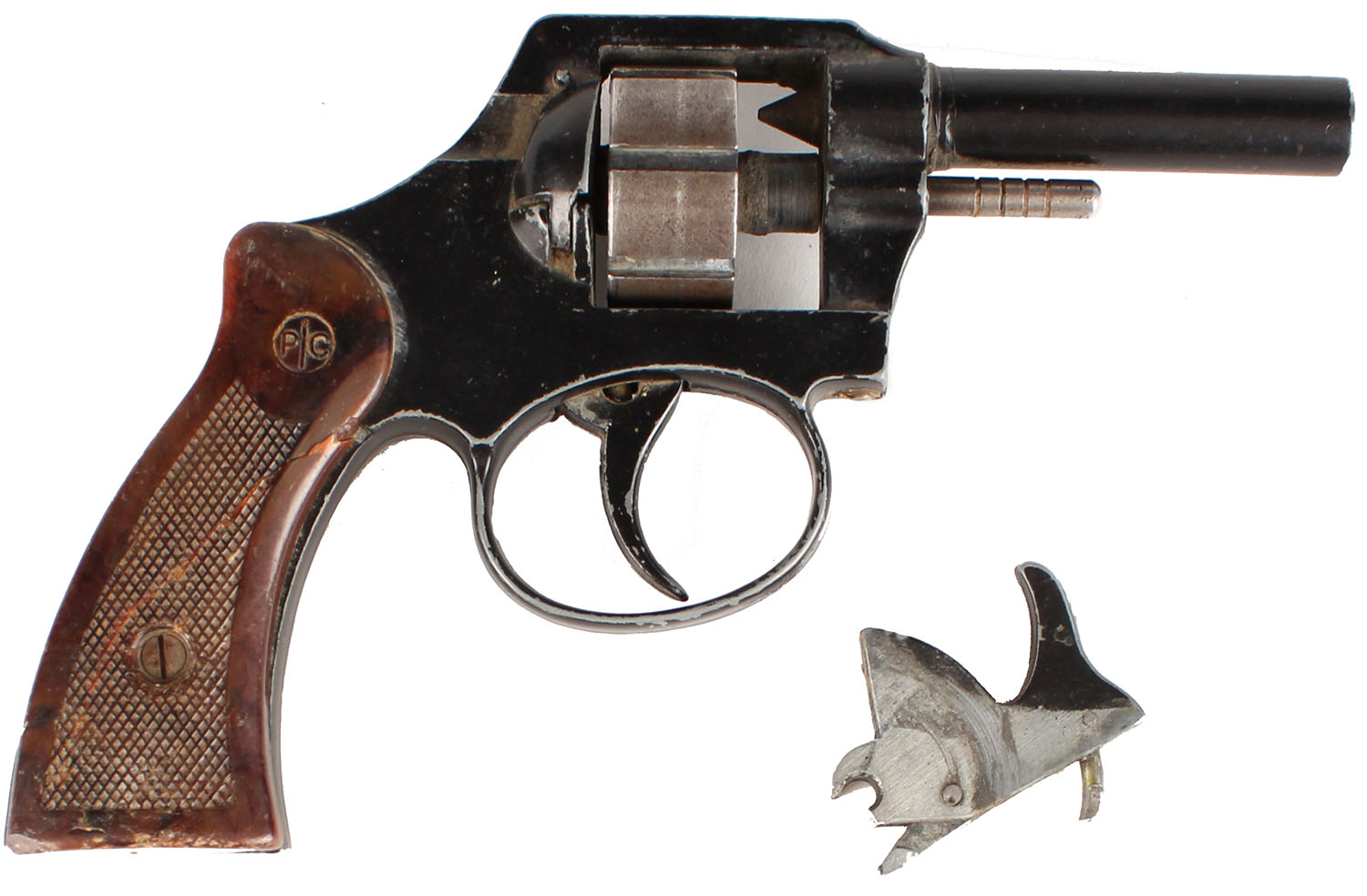 Italian Produced Starter Pistol, CAL: 22 BLANK, MFG: N/A, Double Action Revolver, No Barrel. The S/L marked checkered plastic grips are good, they have numerous contusions & dings. The matte black finish rates 80% overall. No sights. The trigger functions & cylinder rotates, but the hammer assembly is disconnected & doesn't function. NON FUNCTIONING, This is being sold as a parts gun, sold as-is, NO RETURNS ON THIS LOT. Starter Pistol, No FFL Req. - Value: 40 to 100
