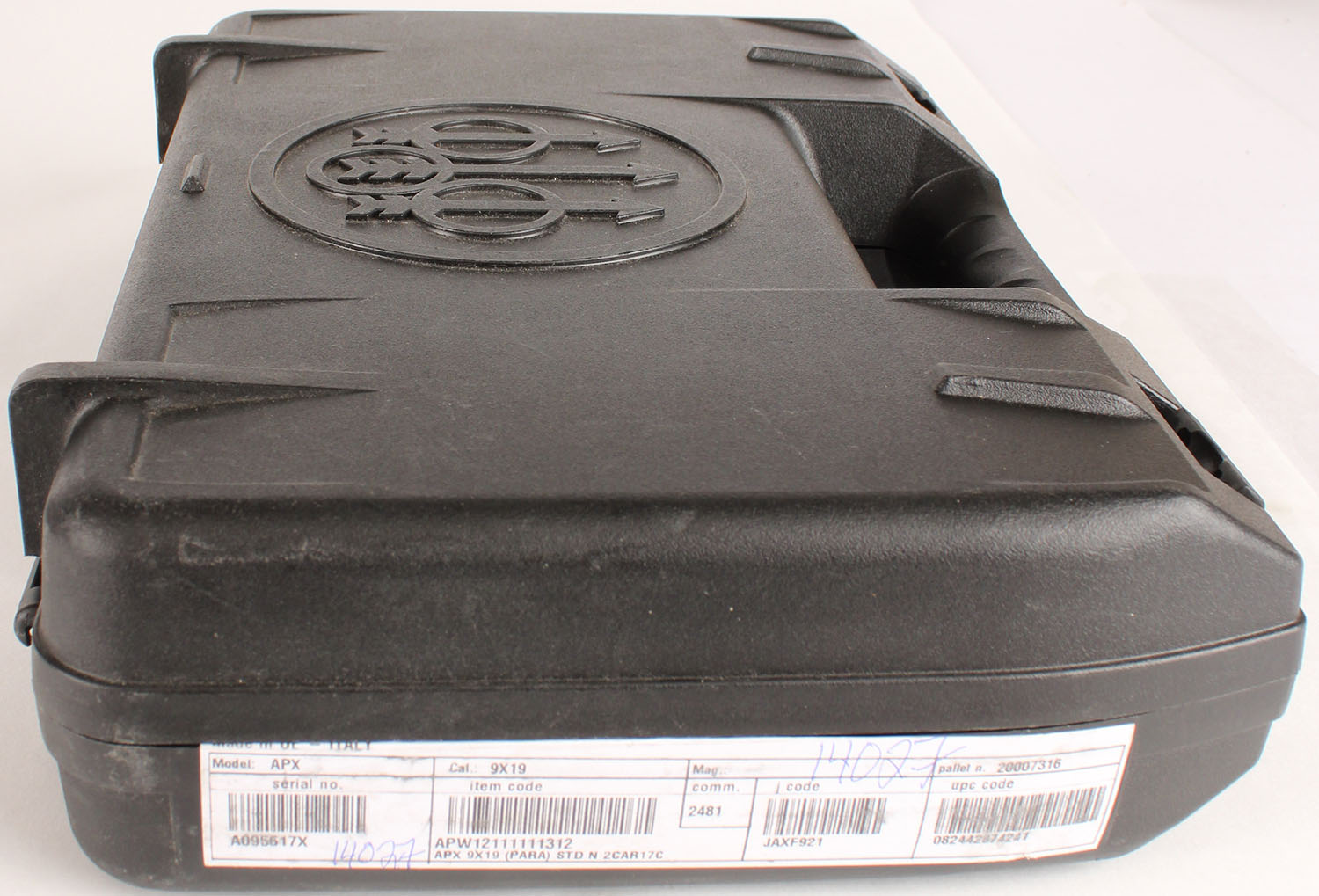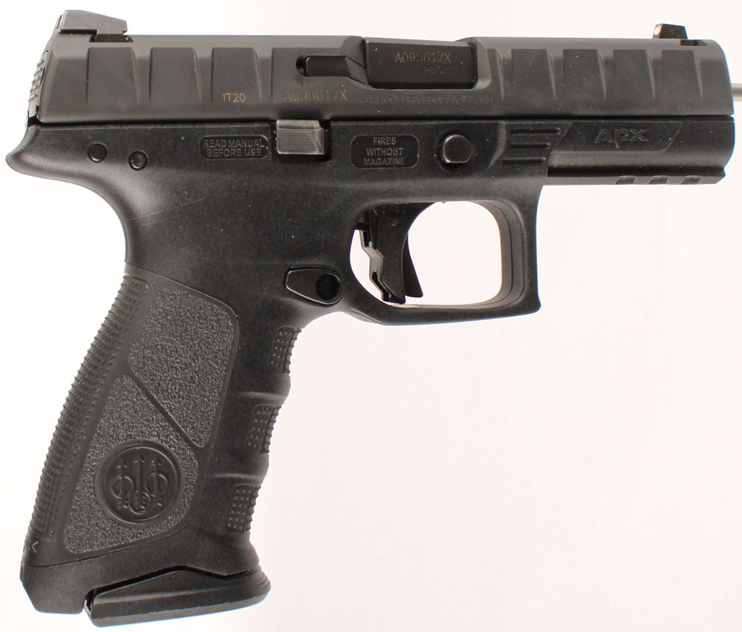 Beretta, Model APX, CAL: 9mm, MFG: Modern, SN: A095617X, Semi Auto Pistol, 4 1/8'' barrel. The Beretta marked Techno polymer frame is excellent. The matte black finish on the slide is excellent, rating 99%. Bore is near mint. Factory sights. Comes in the original hard case, with the owners manual, cleaning brush, lock, extra mag, extra grips & speed loader. FFL Req. - Value: 250 to 400