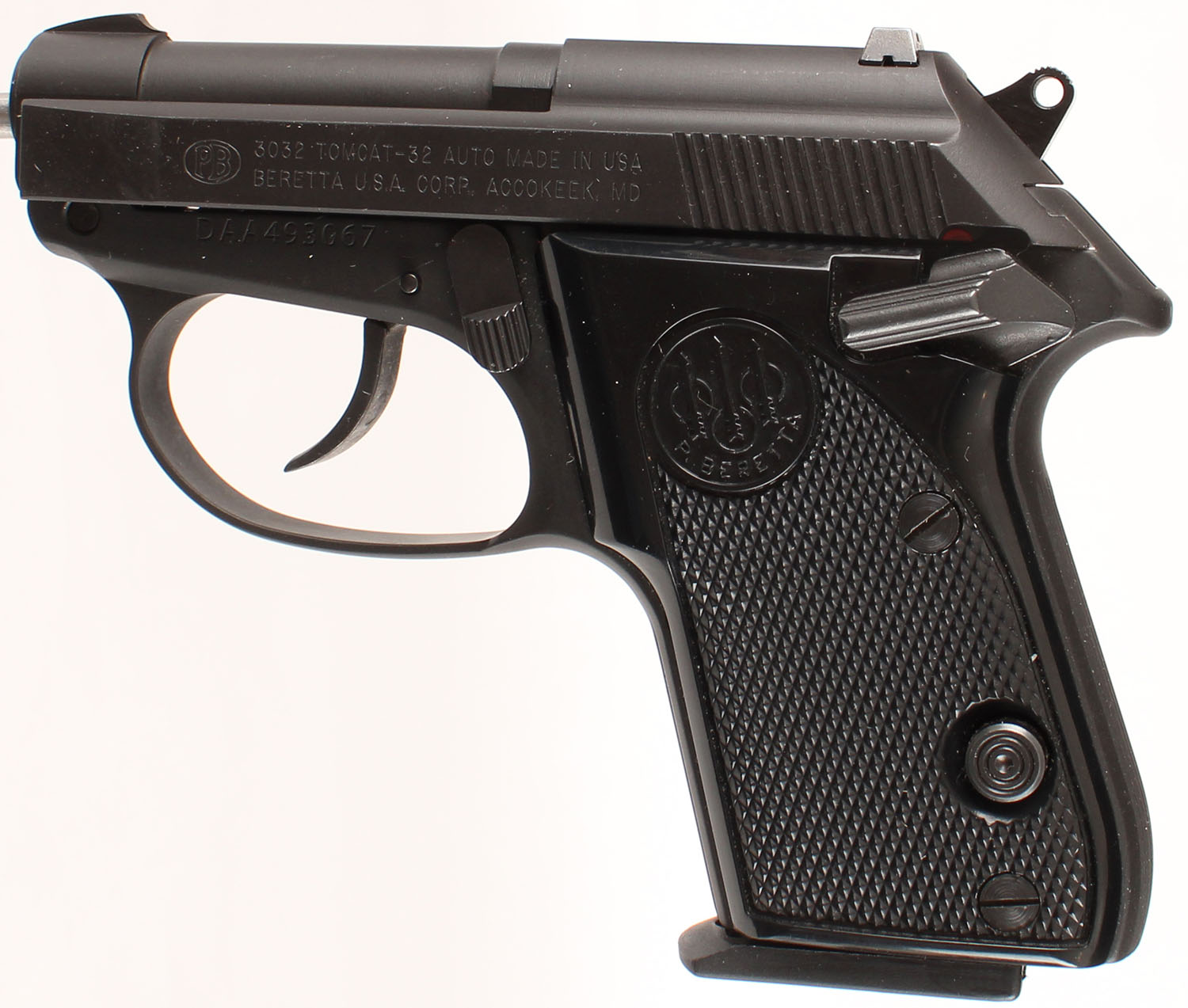 Beretta, Model 3032 Tomcat, CAL: 32 Auto, MFG: Modern, SN: DAA493067, Semi Auto Pistol, 2 3/8'' barrel. The Beretta checkered plastic grips are excellent. The factory matte black finish rates 98% overall. Bore is excellent. Fixed rear sight & small blade front sight. The popularity of these is commonly attributed to the loading procedure, which does not require the user to ''rack'' the slide to chamber a round, but place a round in the tip-up barrel before the magazine is inserted. This is especially popular for those with weaker or smaller hands. FFL Req. - Value: 200 to 400