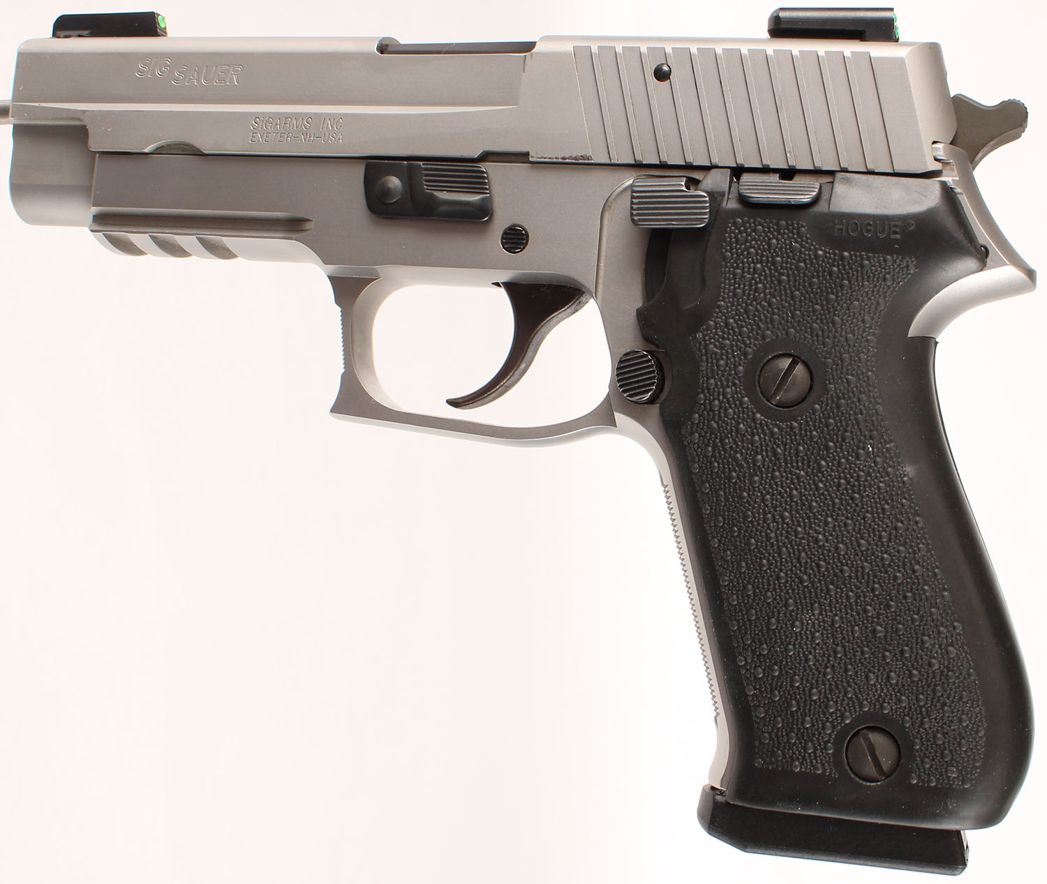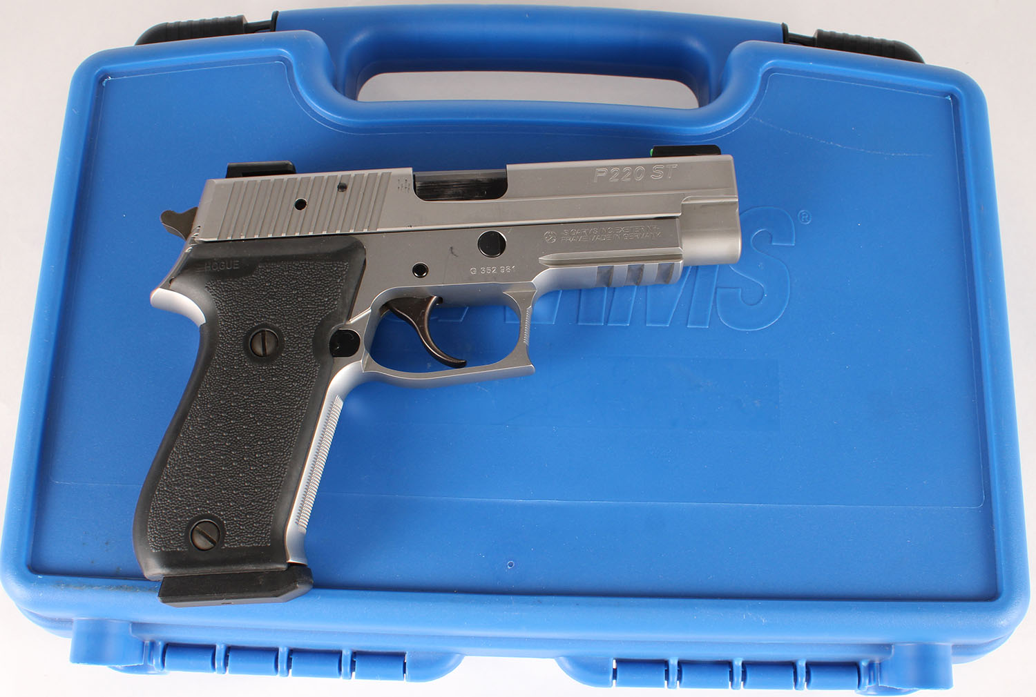 CASED, Sig Sauer, P220 ST, CAL: 45 ACP, MFG: Modern, SN: G352981, Semi Auto Pistol, 4 1/4'' barrel. The Hogue textured grips are excellent. The stainless steel finish is excellent. There are a couple minor handling marks & scuffs. Bore is excellent. The slide holds TruGlo Tritium Night Sights. Comes in factory blue hard case, with related paperwork, hang tang, lock/key, cleaning brush & patches. FFL Req. - Value: 600 to 1000
