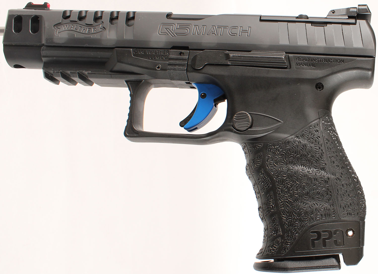 CASED, Walther, Q5 Match, CAL: 9mm, MFG: Modern, SN: FC02759, Semi Auto Pistol, 5'' barrel. The textured polymer grip frame is excellent, with minor handling marks. The factory matte black finish on the ported slide rates 99%. Bore is excellent. LPA adjustable rear sight & red fiber optic rail front sight. Comes in factory hard case with (3) interchangeable reticle sight plates, interchangeable grip panels, (2) extra mags, speed loader, tools & related paperwork. From Walther website: The Q5 Match is superior performance taken to the next level through heightened functionality and a relentless determination to deliver precisely what the experienced shooter demands. FFL Req. - Value: 700 to 1000