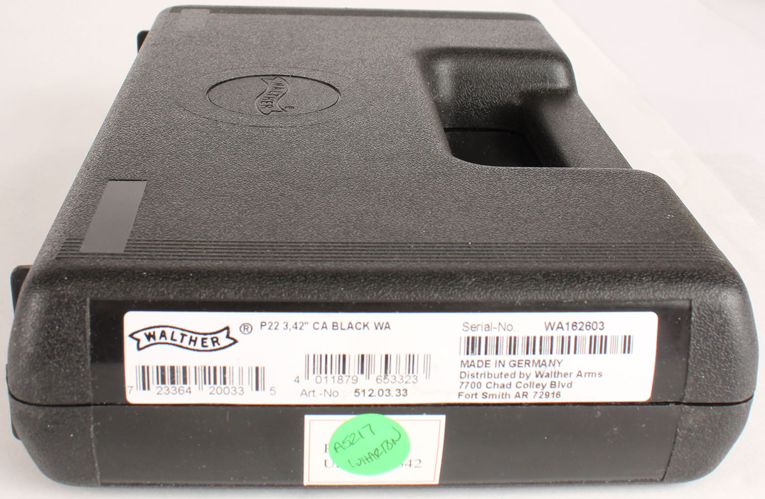CASED Walther, P22 CA (California Compliant), CAL: 22 LR, MFG: Modern, SN: WA162603, Semi Auto Pistol, 3 3/8'' barrel. The textured polymer grip frame is excellent. The metal blue finish on the slide rates 98%. There is minor wear on the top of the chamber. Bore is excellent. The slide holds a dual white dot rear sight & single white dot blade front sight. Comes in original hard case, with (1) additional mag, speed loader & owners manual. FFL Req. - Value: 200 to 400