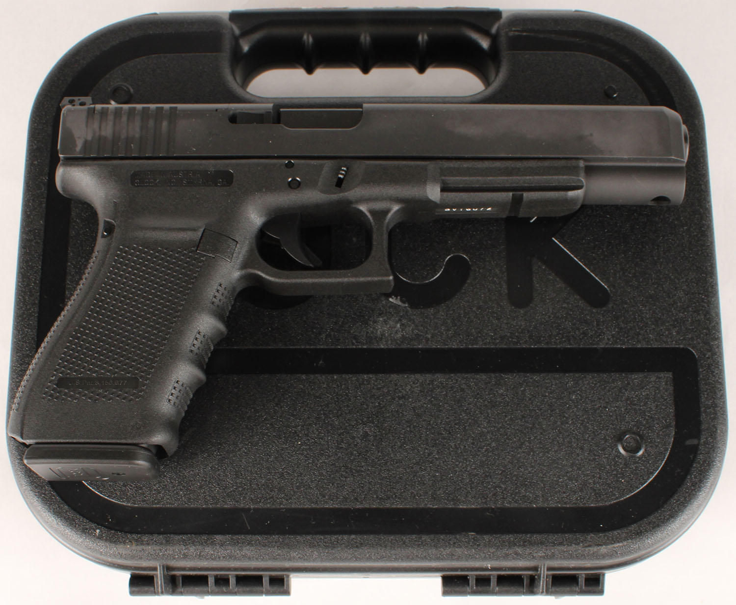 NEW CASED, Glock, Model 40 Gen 4 MOS, CAL: 10mm, MFG: Modern, SN: BVYG072, Semi Auto Pistol, 6'' barrel. The textured polymer grip & frame are mint. The factory matte black finish is mint. Bore is mint. Factory square notch white rear sight & single white dot front sight. Comes in the original factory hard case, with owners manual, lock/key, cleaning rod, 2 grip attachments, MOS Adapter Set 02, (3) 15rd mags & speed loader. NOS. FFL Req. - Value: 600 to 900