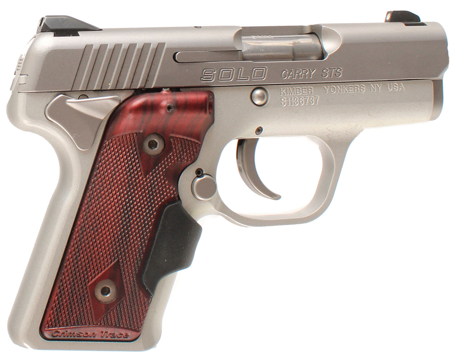 Kimber, Solo Carry STS, CAL: 9mm, MFG: Modern, SN: S1136737, Semi Auto Pistol, 2 3/4'' barrel. The Crimson Trace checkered grips are excellent. The stainless steel finish is excellent overall, with minor storage marks. Bore is excellent. Factory white dot sights. Comes in Kimber marked soft case, with extra mag. FFL Req. - Value: 400 to 600